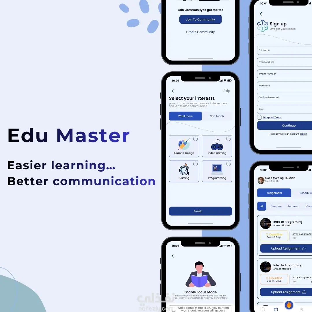 تصميم واجهات تطبيق تعليمي باسم EduMaster، وهو منصة تعليمية متكاملة تجمع بين مميزات تطبيقات الاجتماعات الافتراضية (Teams) وإدارة الفصول الدراسية (Class rooms) ، لتسهيل عملية التعلم عن بُعد. ميزات التطبيق: حضور الفصول الافتراضية عبر الاجتماعات المباشرة رفع ومشاركة المواد التعليمية بسهولة إدارة الواجبات وتسليمها إلكترونيًا تواصل مباشر بين الطلاب والمعلمين إشعارات فورية بالمواعيد والمهام واجهة سهلة الاستخدام تناسب جميع الأعمار وضع التركيز (Focus Mode) لتقليل المشتتات ومساعدة الطلاب على التركيز أثناء الدراسة تم تصميم واجهات التطبيق باستخدام Figma مع التركيز على: تجربة مستخدم سهلة ومنظمة تصميم واضح يساعد الطلاب على التركيز استخدام ألوان هادئة مناسبة لبيئة تعليمية تنظيم المحتوى لتسهيل الوصول إلى الدروس والواجبات