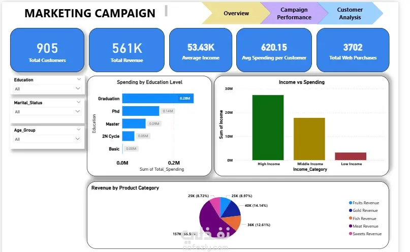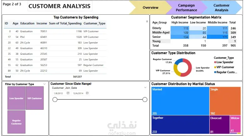 قمت بتصميم وتنفيذ لوحة تحكم تفاعلية لتحليل بيانات العملاء باستخدام Power BI، بهدف مساعدة الشركات على فهم سلوك العملاء وتحسين القرارات التسويقية. ? فكرة المشروع تحليل بيانات العملاء لاكتشاف الأنماط الشرائية، تقسيم العملاء حسب القيمة، وتحديد الفئات الأكثر ربحية لدعم استراتيجيات النمو وزيادة الأرباح. ? أهم مميزات لوحة التحكم ✅ عرض أفضل العملاء من حيث الإنفاق (Top Customers) ✅ تقسيم العملاء حسب: الفئة العمرية مستوى الدخل نوع العميل (VIP – Regular – Low Spender) ✅ تحليل توزيع العملاء حسب الحالة الاجتماعية ✅ مصفوفة Segmentation تربط بين العمر والدخل ✅ فلاتر تفاعلية حسب: نوع العميل تاريخ الانضمام ? التقنيات المستخدمة Power BI Data Cleaning & Transformation DAX Calculations Data Modeling Interactive Visualizations