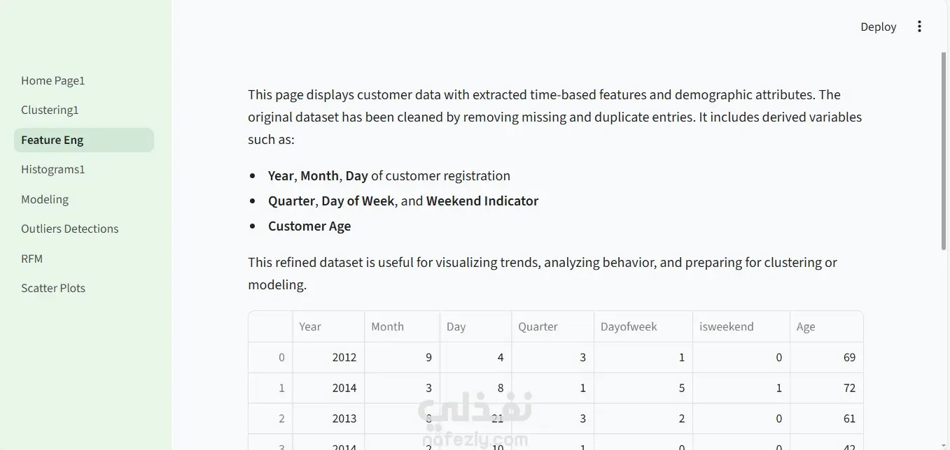 يهدف هذا المشروع إلى معالجة وتحسين بيانات العملاء من أجل إعدادها لعمليات التحليل المتقدم مثل التقسيم (Clustering) أو النمذجة التنبؤية. تم تنفيذ المشروع باستخدام مكتبات Python مثل: pandas لمعالجة البيانات numpy للحسابات datetime لاستخراج الخصائص الزمنية streamlit لعرض البيانات بشكل تفاعلي ? خطوات العمل داخل المشروع 1️⃣ تنظيف البيانات (Data Cleaning) إزالة القيم المفقودة (Missing Values) حذف البيانات المكررة (Duplicates) 2️⃣ استخراج خصائص زمنية (Time-Based Feature Engineering) تم تحويل عمود تاريخ تسجيل العميل Dt_Customer إلى صيغة تاريخ، ثم استخراج: Year (سنة التسجيل) Month (شهر التسجيل) Day (يوم التسجيل) Quarter (الربع السنوي) Day of Week (اليوم في الأسبوع) Weekend Indicator (تحديد إذا كان التسجيل في عطلة نهاية الأسبوع) 3️⃣ حساب عمر العميل (Customer Age) تم حساب عمر العميل باستخدام: Age = Current Year - Year_Birth 4️⃣ تقليل الأعمدة غير الضرورية تم حذف الأعمدة غير المهمة للتحليل الحالي مثل: البيانات التعريفية (ID) بيانات الإنفاق التفصيلية بيانات الحملات التسويقية متغيرات ديموغرافية غير مطلوبة وذلك للحصول على Dataset نظيف ومناسب للتحليل. 5️⃣ عرض البيانات تم استخدام Streamlit لإنشاء واجهة تفاعلية تعرض البيانات بعد المعالجة، مما يسهل: استكشاف البيانات تحليل الاتجاهات تجهيز البيانات للتقسيم أو النمذجة
