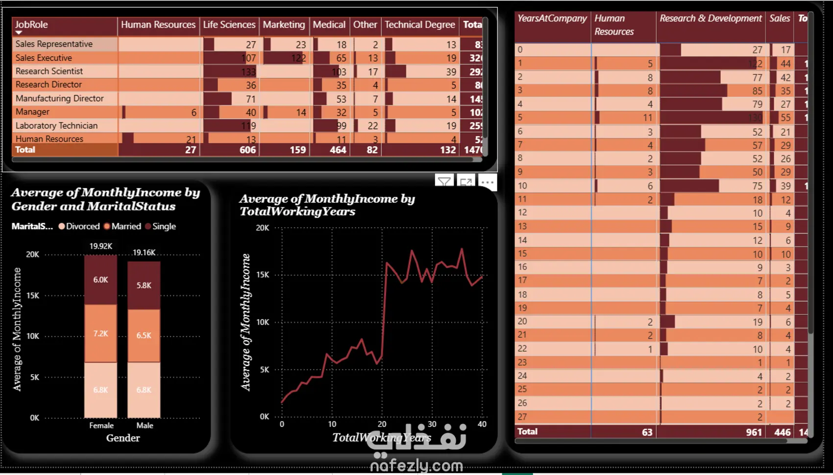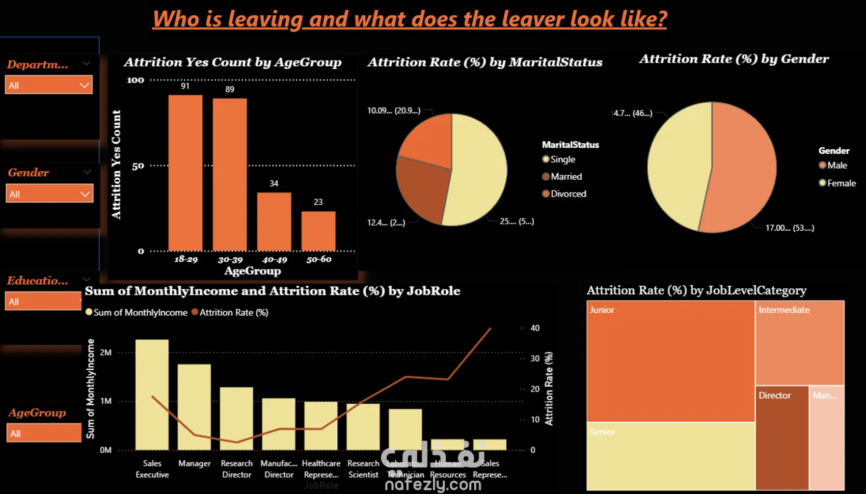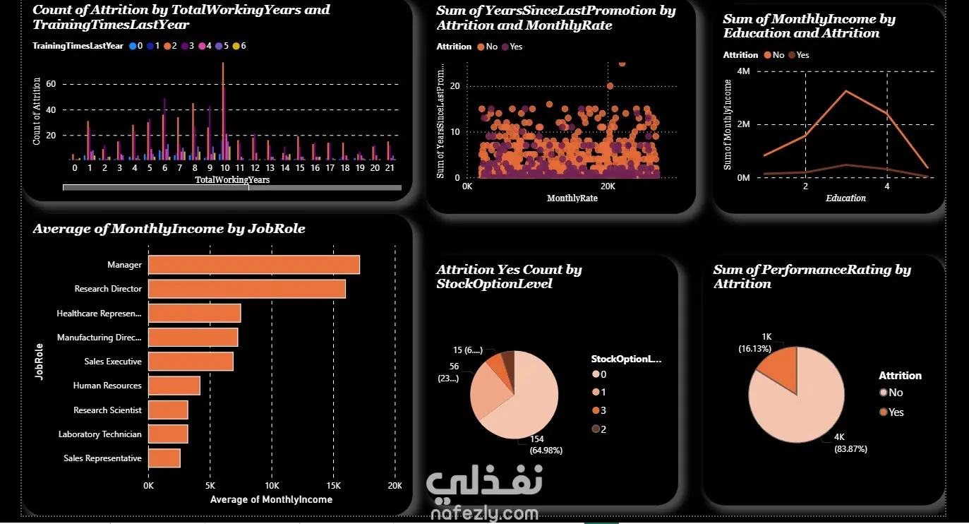 قمت بتصميم داشبورد تفاعلي باستخدام Power BI لتحليل بيانات شركة بهدف دراسة أسباب مغادرة الموظفين تم تحليل البيانات عبر عدة أبعاد مختلفة لاكتشاف العوامل المؤثرة في قرار ترك العمل، مع عرض النتائج من خلال رسوم بيانية واضحة تساعد في فهم الأنماط والعلاقات داخل البيانات. يتكون الداشبورد من أربع صفحات رئيسية، حيث يركز كل قسم على بعد معين لضمان تنظيم التحليل بشكل منطقي وسهل التتبع. مميزات الداشبورد: 1-تقسيم منظم للتحليل عبر 4 شيتات 2-تفاعل كامل بين الرسوم البيانية 3-إمكانية التصفية حسب: القسم النوع المستوى التعليمي وغيرها من الأبعاد 4-عرض بصري واضح يساعد الإدارة على فهم أسباب المغادرة واتخاذ قرارات مبنية على البيانات ساهم هذا التحليل في تسهيل تحديد العوامل الأكثر تأثيرًا على استقرار الموظفين داخل الشركة.