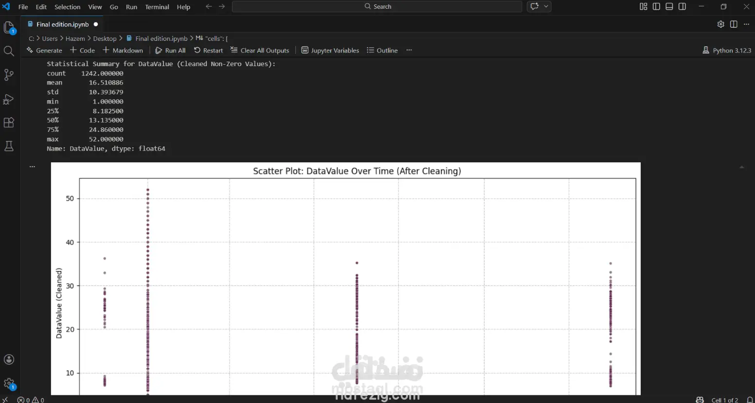 جمع البيانات (Data Acquisition): يقوم الكود بسحب بيانات حية من بوابة البيانات المفتوحة لمدينة نيويورك باستخدام "API"، ويركز على مؤشرات مثل الجسيمات الدقيقة (PM 2.5) وثاني أكسيد النيتروجين (NO2). معالجة وتنظيف البيانات (Data Preprocessing & Cleaning): يحدد المشروع القيم المفقودة والمتطرفة (Outliers) ويتعامل معها لضمان دقة التحليل. يوحد وحدات القياس (مثل تحويل "ppb" إلى قيم مكافئة) ويزيل الصفوف المكررة. التحليل الإحصائي: يقدم ملخصات إحصائية للبيانات مثل المتوسط (Mean)، والوسيط (Median)، والقيم العظمى والصغرى لمستويات التلوث المسجلة. التصور البياني (Visualization): يستخدم المكتبات البرمجية (مثل Matplotlib و Seaborn) لإنشاء رسوم بيانية توضح: توزيع ملوثات الهواء ومقارنتها عبر الزمن. المناطق الـ 10 الأكثر تلوثاً في المدينة. خريطة حرارية (Heatmap) توضح العلاقة بين المناطق المختلفة وأنواع الملوثات