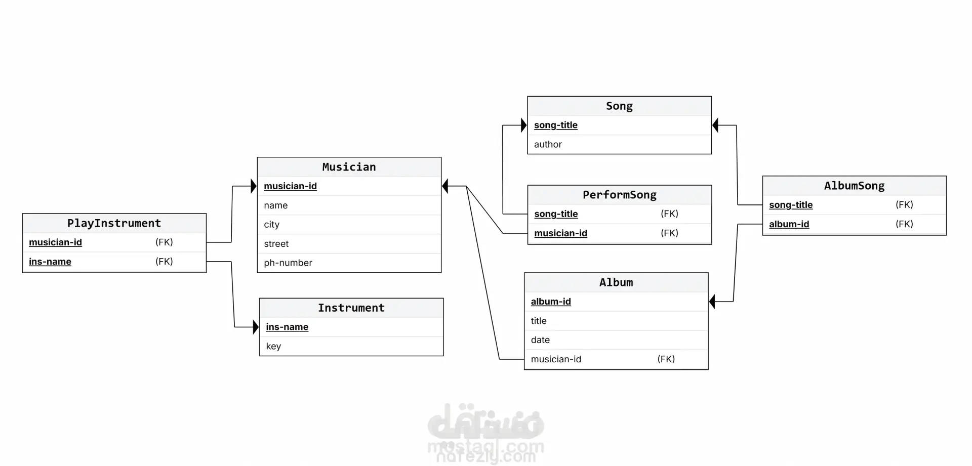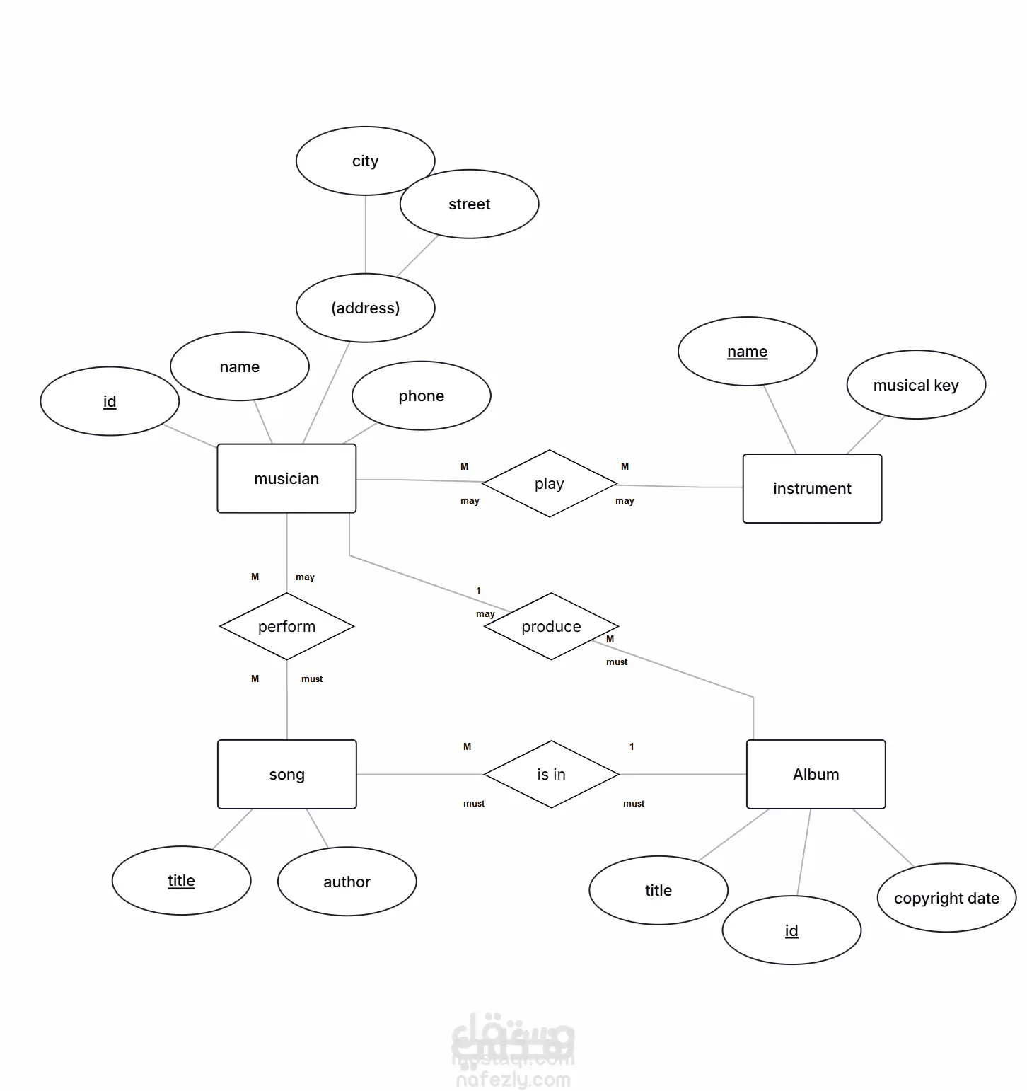 تصميم قواعد بيانات متكاملة، بدءاً من رسم مخططات الكيانات والعلاقات (ERD)، مروراً بتحويلها إلى جداول (Mapping)، وانتهاءً بتطبيقها فعلياً باستخدام SQL. - الأدوات والتقنيات اداة رسم مخططات : ErdPlus قواعد البيانات: SQL Server المفاهيم المطبقة: Entity-Relationship Modeling, Relational Mapping, DDL SQL - خطوات التنفيذ المرحلة الأولى: تحليل المتطلبات 1.قراءة وثيقة المتطلبات لكل نظام وتحديد الكيانات (Entities) والعلاقات (Relationships) والصفات (Attributes) 2.تحديد المفاتيح الأساسية (Primary Keys) والقيود (Constraints) وأنواع العلاقات (1:1, 1:N, M:N) المرحلة الثانية: رسم مخطط ERD 1.رسم الكيانات والعلاقات بين الجداول مع توضيح أنواع العلاقات ودرجات الاشتراك لكل نظام من الأنظمة الخمسة المرحلة الثالثة: تحويل ERD إلى جداول (Mapping) 1.تحويل كل كيان إلى جدول مستقل 2.معالجة العلاقات متعددة-لمتعددة بإنشاء جداول وسيطة (Junction Tables) كجدول Student_Course وجدول Musician_Song وغيرها 3.نقل المفاتيح الأجنبية (Foreign Keys) بشكل صحيح تبعاً لنوع العلاقة 4.معالجة الصفات المركبة كعنوان العميل والتاريخ المقسم المرحلة الرابعة: التطبيق بـ SQL 1.كتابة جملة الانشاء لكل جدول مع تحديد أنواع البيانات والقيود 2.تعريف المفاتيح الأساسية والأجنبية وقيود NOT NULL وUNIQUE 3.التعامل مع الحالات الخاصة كعلاقة المدير بالقسم (Self-referencing أو علاقة منفصلة)