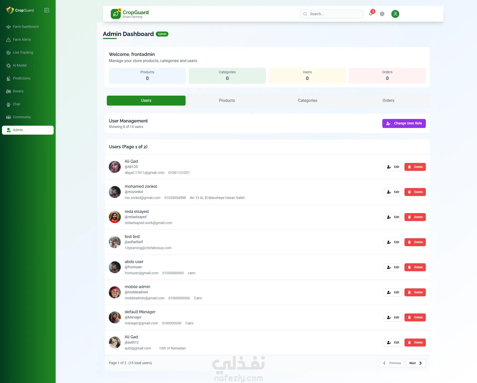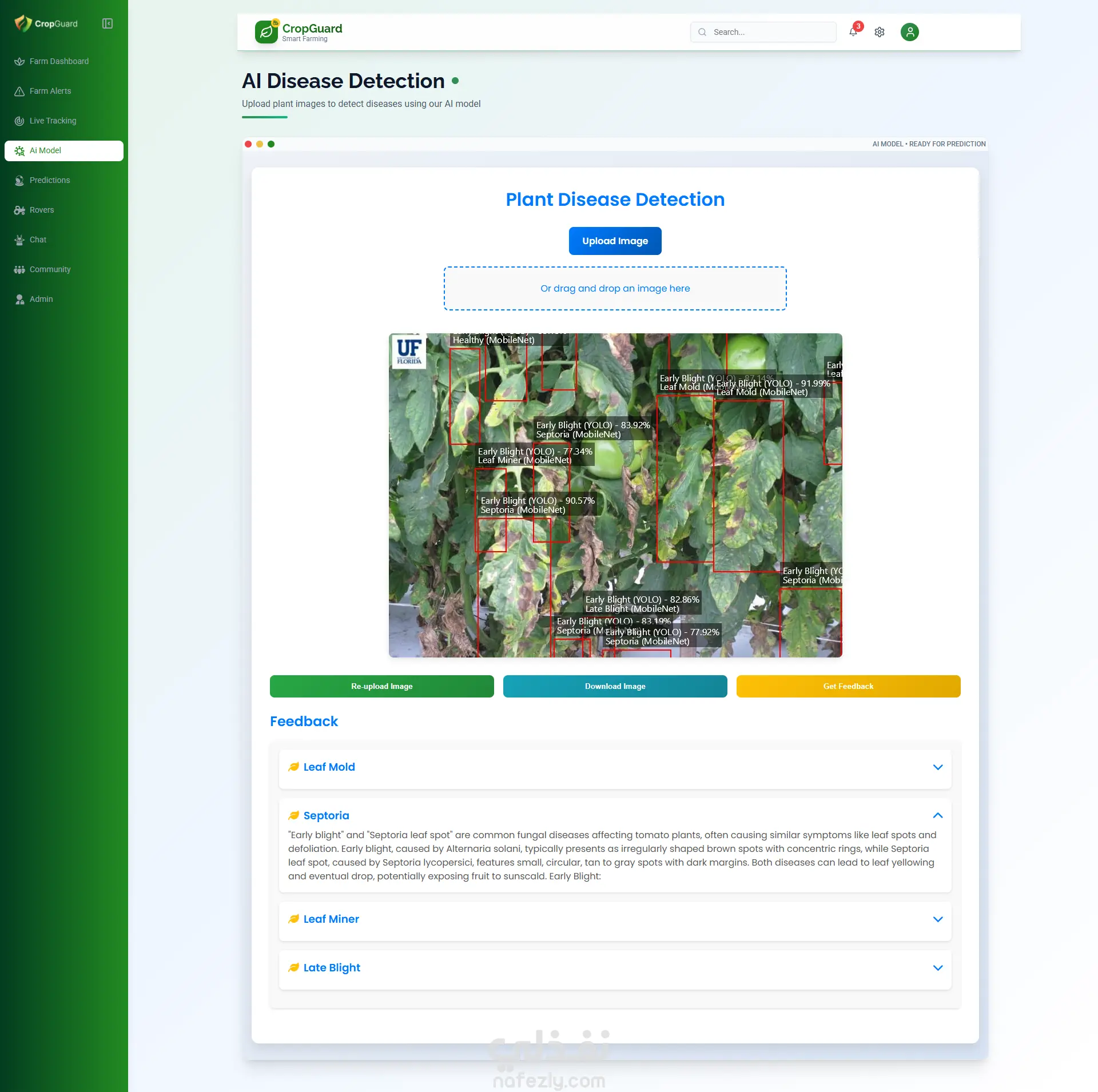 تم تطوير Crop Guard وهي منصة زراعية ذكية تعتمد على تقنيات الذكاء الاصطناعي لمساعدة المزارعين على اكتشاف أمراض المحاصيل، التنبؤ بالمخاطر، وتقديم توصيات عملية تساهم في زيادة الإنتاجية وتقليل الخسائر، وذلك من خلال نظام متكامل يعمل عبر الويب، الموبايل، والأنظمة المدمجة. دوري في المشروع: تطوير الواجهة الأمامية وتصميم تجربة المستخدم (Frontend Development & UI/UX). قمت بتطوير واجهة المستخدم باستخدام Next.js وTypeScript، مع إنشاء Dashboard ديناميكية ولوحات عرض تفاعلية، بالإضافة إلى أقسام للتجارة الإلكترونية والتفاعل المجتمعي بين المستخدمين، مع مراعاة الأداء العالي، الاستجابة لمختلف الشاشات، وتحسين محركات البحث (SEO). تم تصميم واجهة مستخدم حديثة وسهلة الاستخدام مع إضافة حركات وانتقالات سلسة باستخدام Framer Motion، وبناء مكونات قابلة لإعادة الاستخدام باستخدام Shadcn UI لضمان تنظيم الكود وقابلية التوسع. كما تم إدارة الحالة والربط مع الـ APIs باستخدام Redux Toolkit وContext API وAxios، مما ساهم في تدفّق البيانات بشكل سلس وتحديث المحتوى في الوقت الفعلي. التقنيات والأدوات المستخدمة: Next.js، TypeScript، Tailwind CSS، Shadcn UI، Redux Toolkit، Context API، RESTful API، Framer Motion، HTML، CSS.