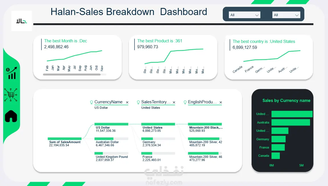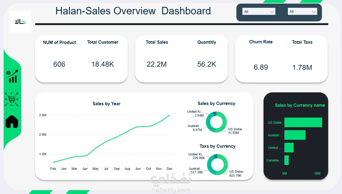 قمت بتنفيذ مشروع تحليل بيانات وتصميم لوحة معلومات تفاعلية لشركة "حالا" بهدف متابعة أداء المبيعات وتحليل المؤشرات الرئيسية لدعم اتخاذ القرار بشكل دقيق وسريع. بدأت العمل بمرحلة تجهيز البيانات وتنظيمها، ثم قمت بتحليلها لاستخراج أهم مؤشرات الأداء الرئيسية (KPIs) مثل إجمالي المبيعات، عدد العملاء، إجمالي الكميات المباعة، معدل فقدان العملاء (Churn Rate)، وإجمالي الضرائب. بعد ذلك قمت ببناء Dashboard احترافي باستخدام Power BI يعرض هذه المؤشرات بطريقة واضحة وتفاعلية. تضمنت لوحة المعلومات: عرض إجمالي المبيعات وتحليلها شهريًا توزيع المبيعات حسب العملات المختلفة تحليل الضرائب حسب كل عملة مقارنة الأداء بين العملات المختلفة متابعة عدد العملاء ومعدل الفقد تم تصميم الداشبورد بواجهة احترافية سهلة الاستخدام، مع إمكانية التصفية والتفاعل حسب الفترة الزمنية أو العملة، مما يسمح للإدارة بمتابعة الأداء في الوقت الفعلي واكتشاف الاتجاهات بسرعة. ساهم المشروع في: توضيح اتجاهات النمو الشهري تحليل تأثير اختلاف العملات على الإيرادات متابعة سلوك العملاء ومعدل الفقد دعم اتخاذ قرارات مبنية على بيانات دقيقة الهدف من المشروع كان تحويل البيانات التشغيلية إلى أداة تحليل قوية تساعد الإدارة على فهم الأداء وتحسين النتائج بشكل مستمر.