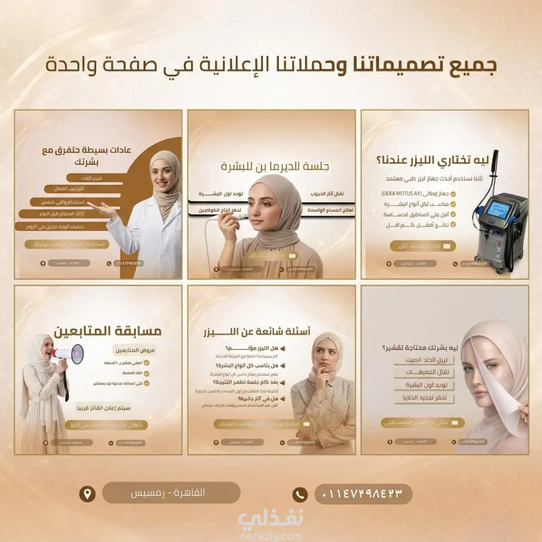 The campaign includes educational posts, service promotions (Laser & Derma Pen), offers, and engagement content — all designed with a soft, premium medical aesthetic and conversion-focused layout.