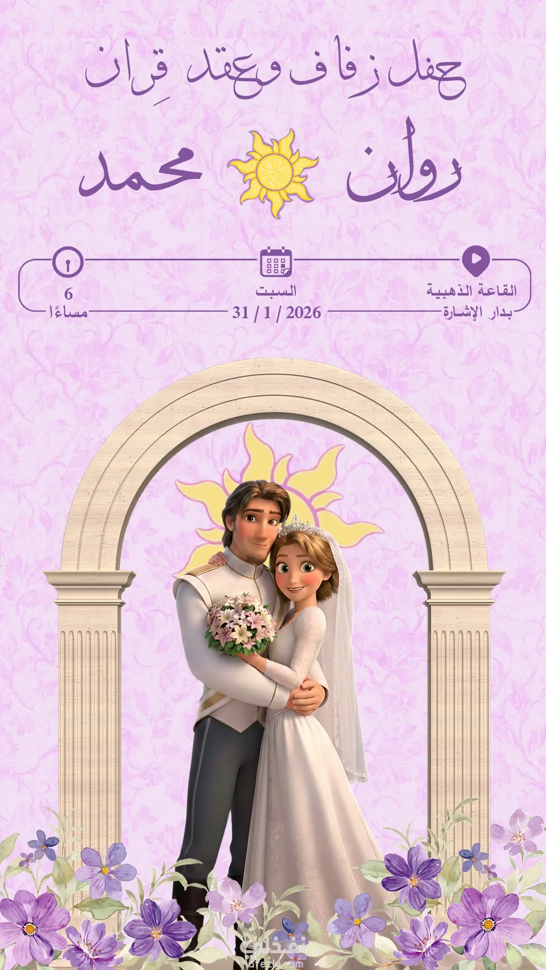 تم تنفيذ تصميم دعوة زفاف رقمية بطابع رومانسي ناعم مستوحى من أجواء القصص الخيالية، مع دمج عناصر كرتونية تعكس أجواء الحب والدفء.