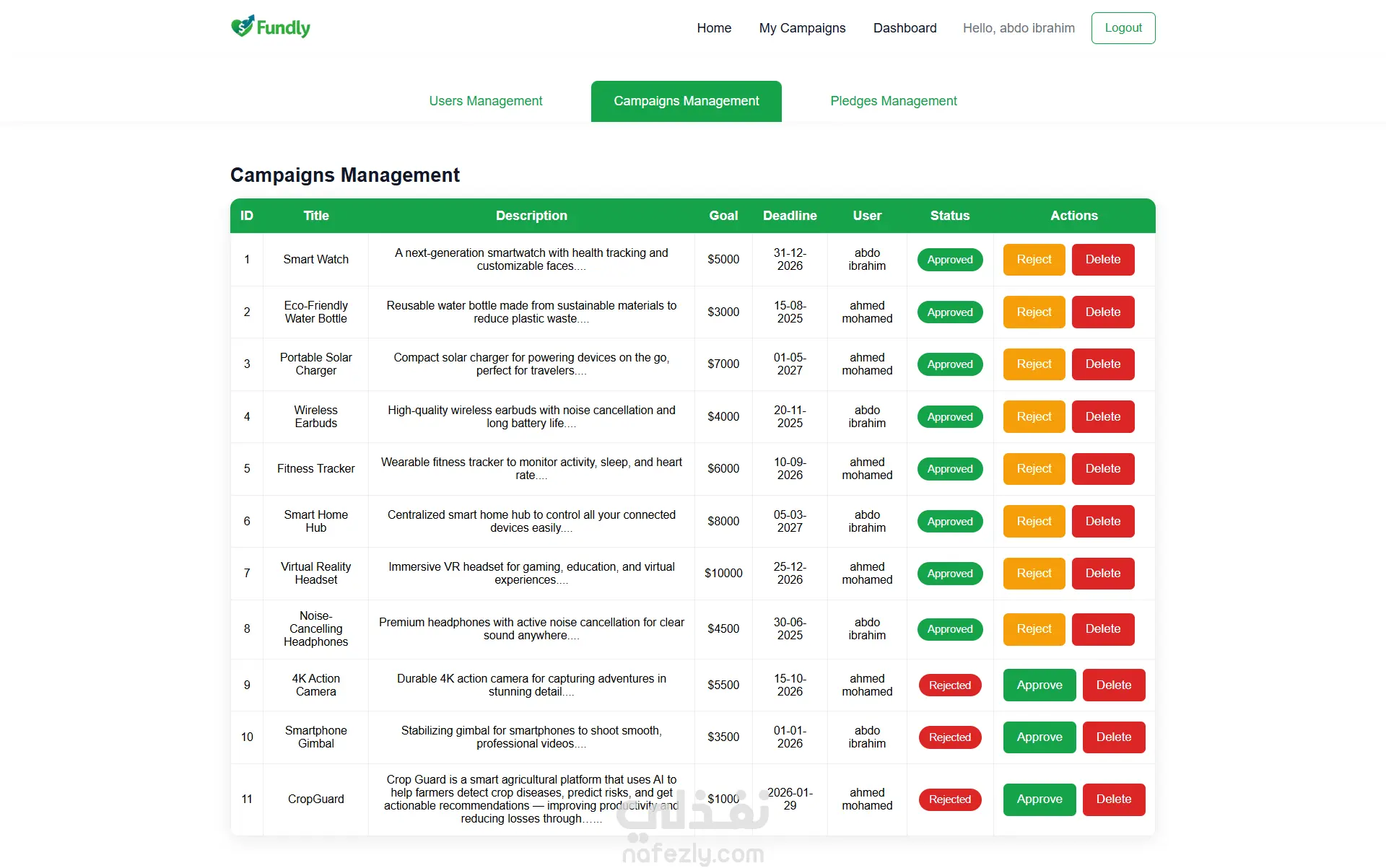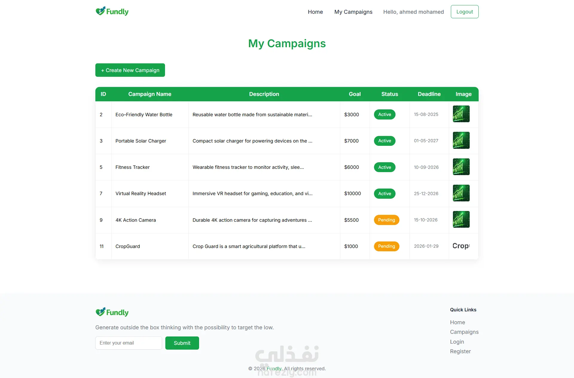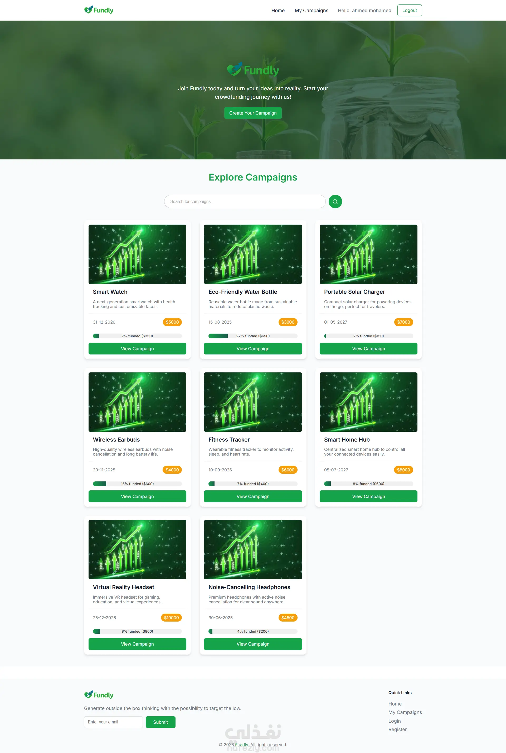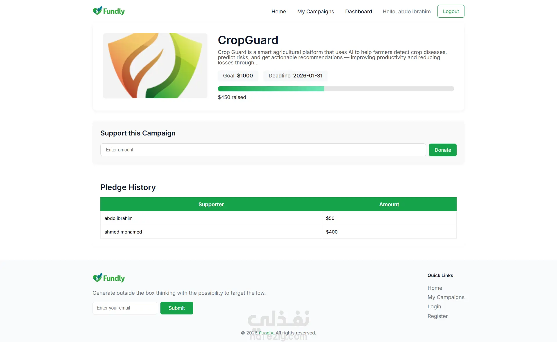 تم تطوير Fundly وهي منصة تمويل جماعي (Crowdfunding Platform) تتيح للأفراد جمع التبرعات لمشاريعهم أو قضاياهم من خلال مساهمات صغيرة من عدد كبير من الداعمين عبر الإنترنت. توفّر المنصة واجهة سهلة الاستخدام لعرض الحملات، استعراض تفاصيل كل مشروع، ومتابعة التبرعات بشكل منظم، مما يسهّل على المستخدمين دعم المبادرات المختلفة والمشاركة فيها. تم تنفيذ المشروع باستخدام TypeScript وHTML وCSS مع الاعتماد على JSON Server لمحاكاة الـ Backend وإدارة البيانات أثناء التطوير، مما يعكس القدرة على بناء تطبيقات تعتمد على API وتنظيم البيانات بشكل احترافي. المشروع يبرز مهارة تطوير واجهات تفاعلية وربطها بمصدر بيانات ديناميكي، مع تنظيم جيد للكود وقابلية للتوسّع مستقبلًا.