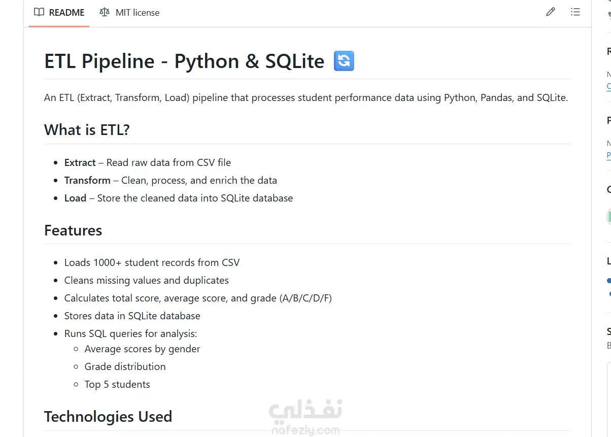 مشروع ETL Pipeline كامل لمعالجة بيانات 1000 طالب، يقوم باستخراج البيانات من CSV وتنظيفها وتحميلها في قاعدة بيانات SQLite مع تحليل SQL متقدم. المهارات المستخدمة: - Python وPandas - SQLite وSQL Queries - تنظيف البيانات - البرمجة كائنية التوجه OOP