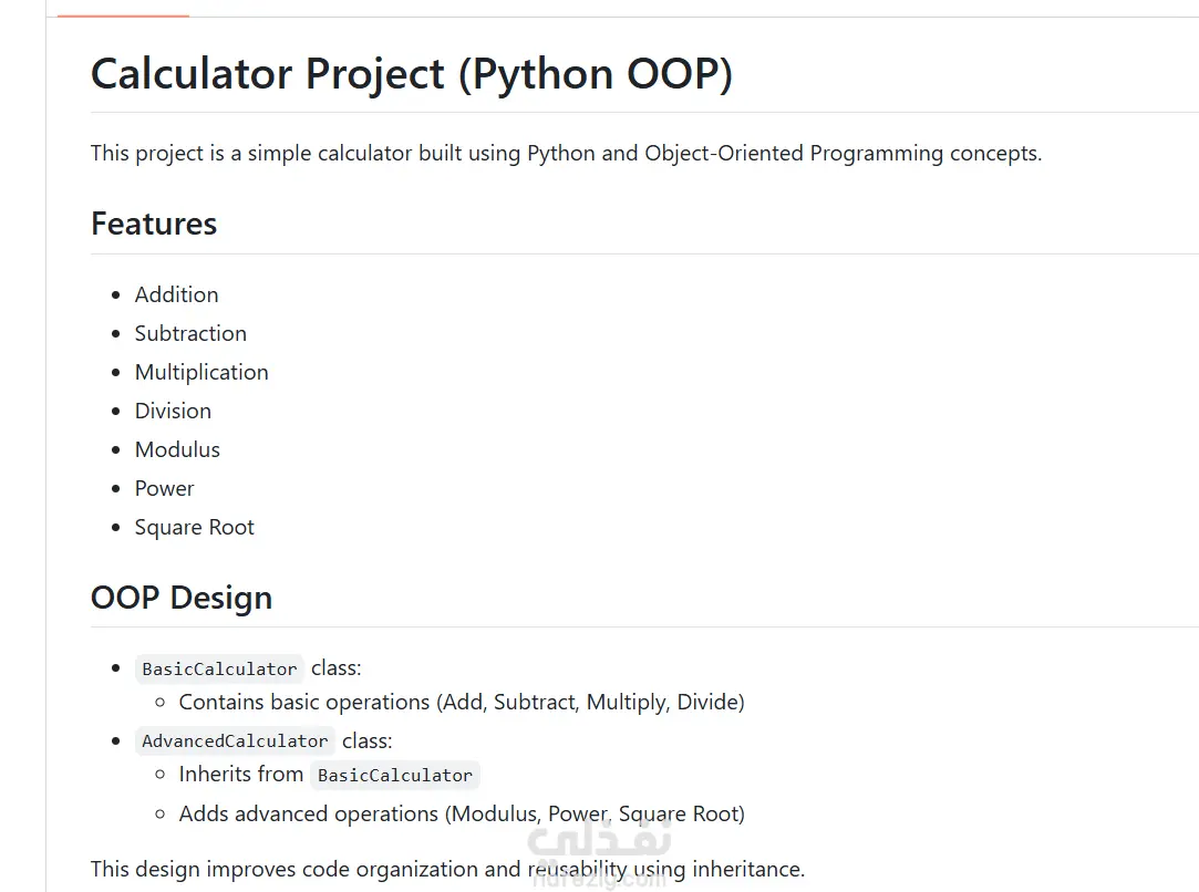 - AdvancedCalculator: يرث من Basic ويضيف