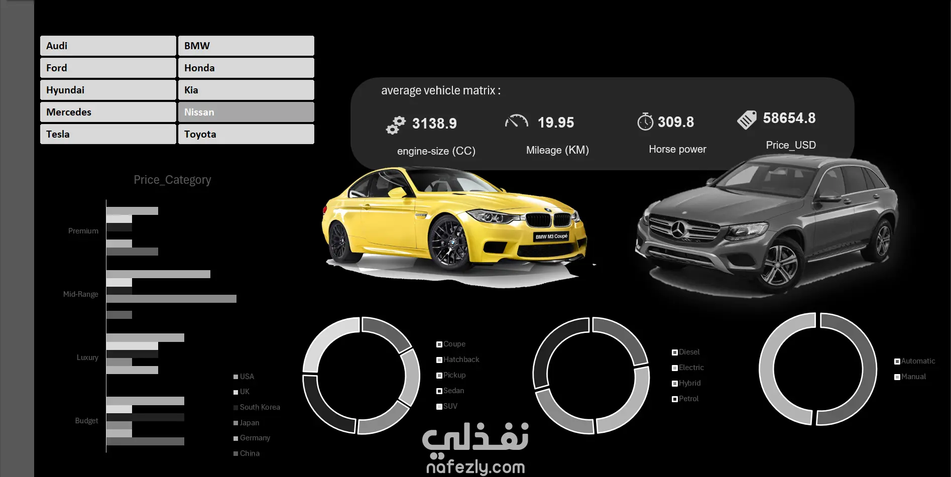 لوحة بيانات تفاعلية متقدمة تستعرض الخصائص التقنية والقيمة السوقية لمختلف العلامات التجارية للسيارات (مثل Audi، BMW، Mercedes، وغيرها). المعدلات العامة للمركبات: توضح اللوحة متوسطات تقنية هامة تشمل حجم المحرك (3138.9 CC)، قوة الأحصنة (309.8 HP)، وكفاءة استهلاك الوقود (19.95 KM). التحليل المالي: يبلغ متوسط سعر المركبات المعروضة حوالي 58,654.8 دولار. تصنيف الفئات والمنشأ: يقارن الرسم البياني الجانبي بين فئات السيارات (اقتصادية، متوسطة، ممتازة، فاخرة) موزعة حسب دول التصنيع مثل الولايات المتحدة، ألمانيا، اليابان، وكوريا الجنوبية. المواصفات الفنية: توفر المخططات الدائرية توزيعاً لأنواع الهياكل (SUV، Sedan، إلخ)، وأنواع الوقود (بنزين، هجين، كهرباء، ديزل)، بالإضافة إلى نوع ناقل الحركة (أوتوماتيك أو يدوي).