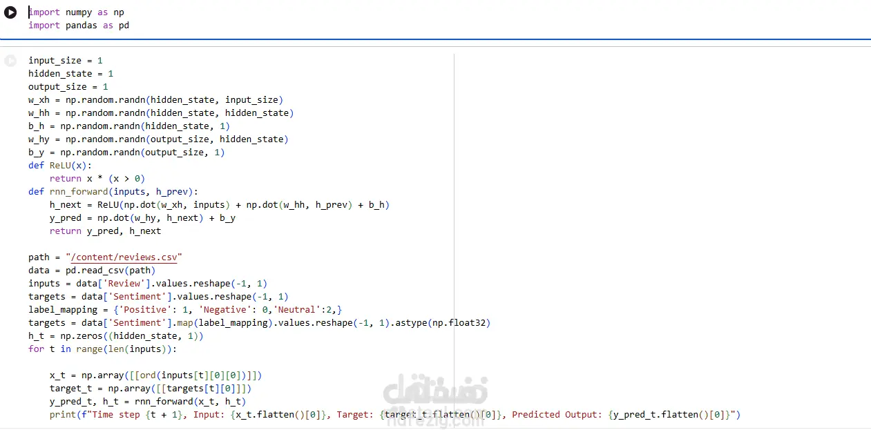 كود بايثون يُنشئ شبكة عصبية متكررة (RNN) بسيطة من الصفر باستخدام مكتبة NumPy. يُعرّف الكود معلمات الشبكة، ويُهيئ الأوزان والانحيازات، ويُطبّق دالة التنشيط ReLU، ويُجري عملية الانتشار الأمامي للتنبؤ بقيم المشاعر من مجموعة بيانات CSV. تُستخدم مكتبة Pandas لتحميل البيانات ومعالجتها مسبقًا، بما في ذلك ربط تصنيفات المشاعر النصية بالقيم العددية، بينما تُعالج الشبكة العصبية المتكررة المدخلات بالتسلسل وتطبع التنبؤات في كل خطوة زمنية.