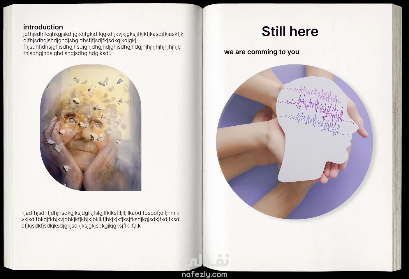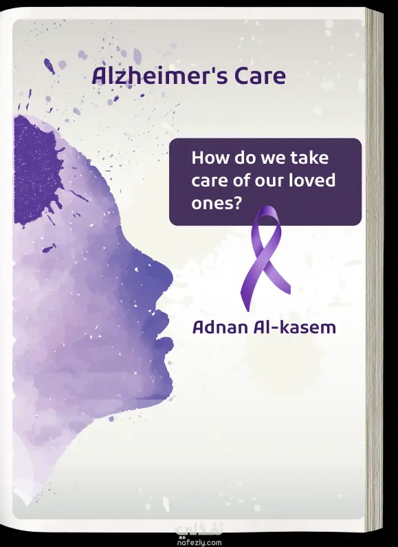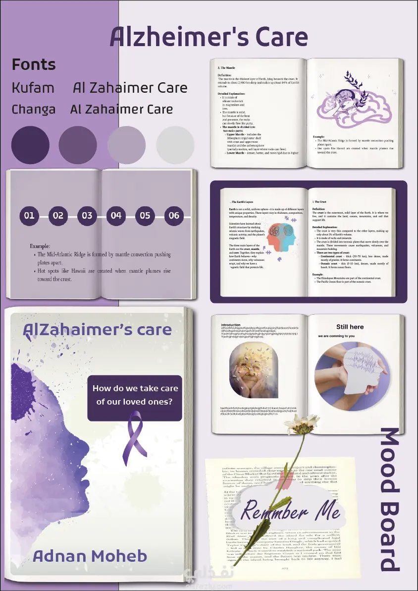 صفحة الهام عن كتاب لرعاية مرضى الزهايمر تتضمن الالوان المستخدمة والخطوط وصفحات من الكتاب توضح التسليل والتكامل والتناسق بين محتوياته