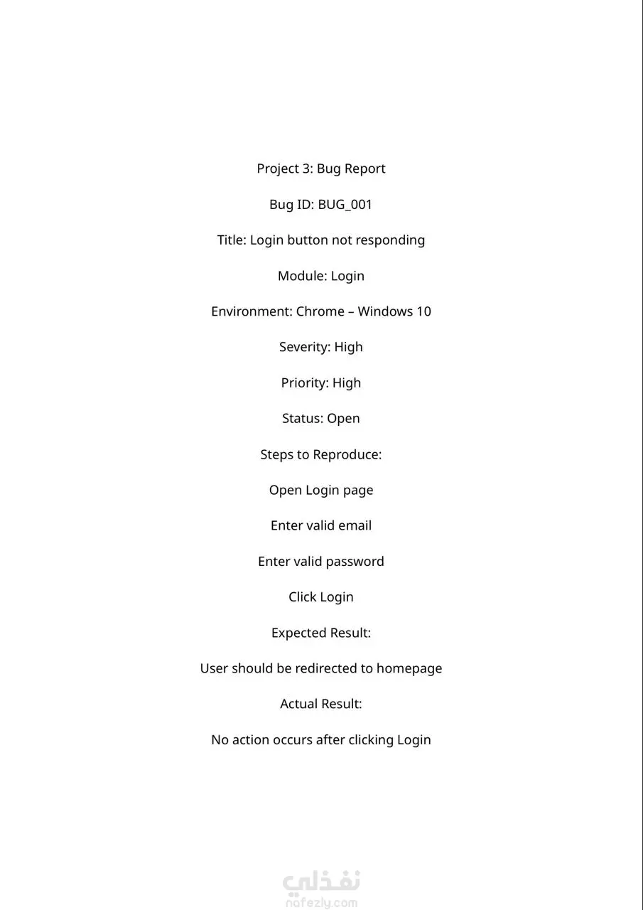 In this project, I simulated the process of discovering and documenting a bug failure in the login function. The report included: • Define steps to reproduce error (Steps to Reproduce) in a simplified way for developers. • Analysis of the actual result (actual result) against the expected result. • Determining the degree of severity (Severity) and priority (Priority) of the gap (High). • Provide details of the work environment in which the error appeared to ensure the speed of repair.