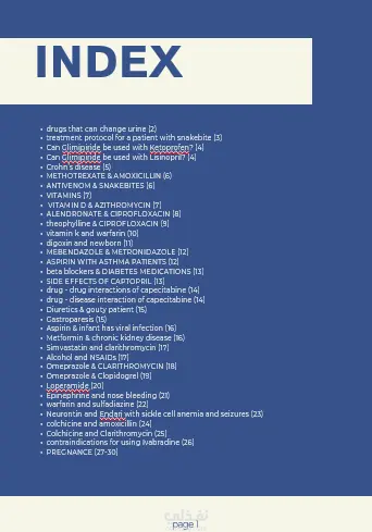 سلام عليكم و رحمة الله و بركاته تحية طيبة و بعد أود أن أقدم لكم مجلة علمية عن DRUG INFORMATION CENTER NEWSLETTER و هي عبارة عن عمل مفصل و ملخص بسيط لبعض من الأسئلة الشائعة عن الأدوية و التفاعلات التي تكون بينها و بين الطعام و التي تستعمل أيضا في الحمل تقدم المجلة كل ما هو مريح للعين من حيث الألوان و ترتيب الصفحات من حيث التصميم مع وجود خط ملائم يكون صالح للرؤية و فهرس يتحدث عن كل موضوع و أرقام صفحات لمعرفة الموضوع الذى تبحث عنه و وجود صور تتحدث عن المواضيع لكى تكون مفهومة للقارئ بهيئة سهلة و مبسطة و وجود لوجو المنظومة للجهة التعليمية أتمنى أن ينال إعجابكم و أعدكم سيتم توفير ما هو موجود في الملف و لكم جزيل الشكر مع تحياتي د. محمد بهاء