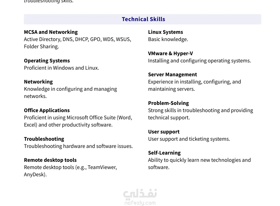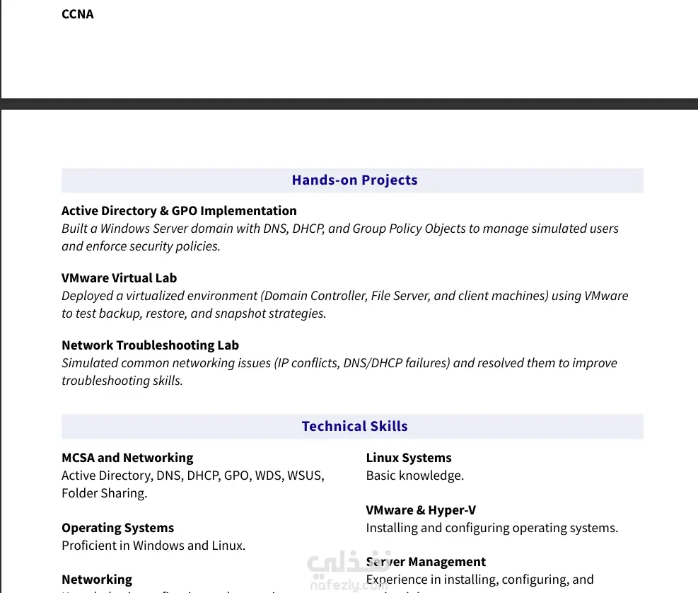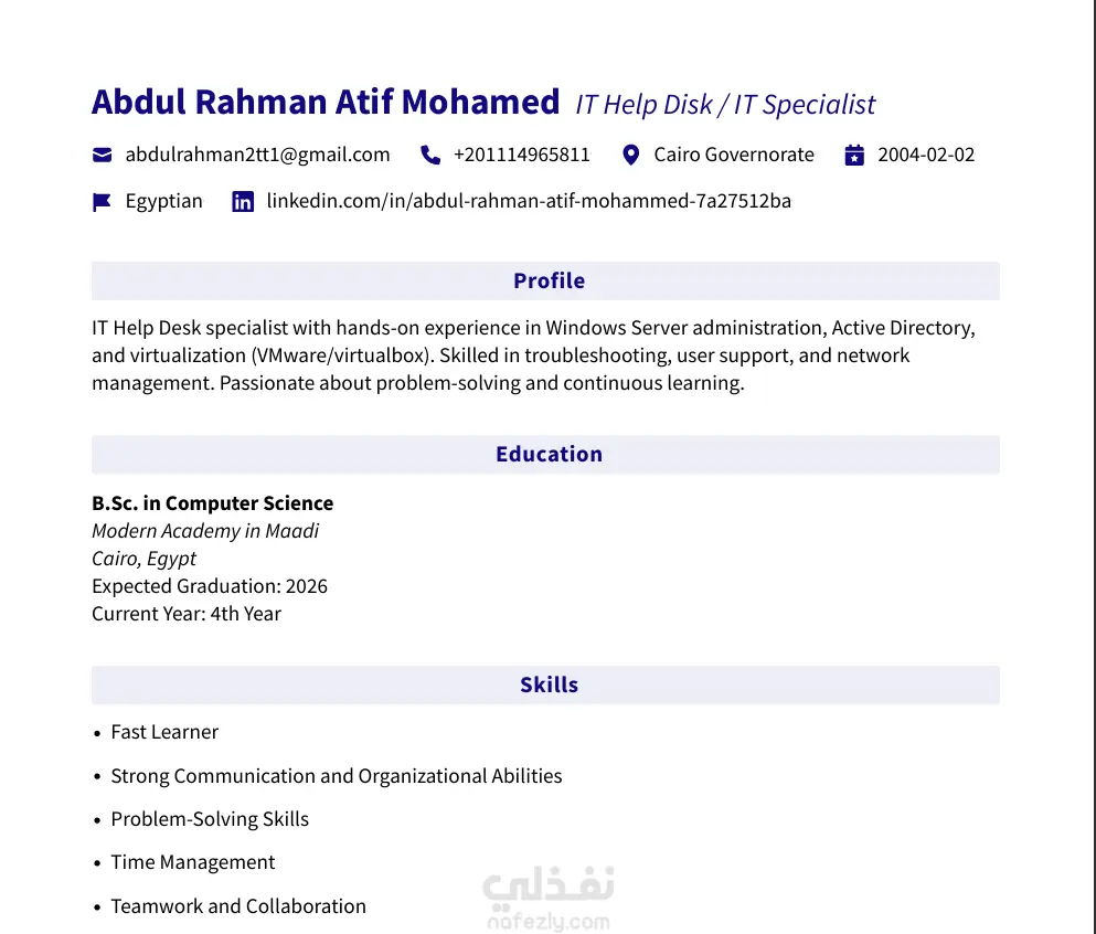 يسعدني ان اشارك اخر اعمالي لانشاء سيرة ذاتيه و هو cv خاص بي شخصيا و كان سببا في قبولي في وظيفية IT Help Desk حيث اني استخدم بعض المواقع و الادوات مثل : Canva flowcv