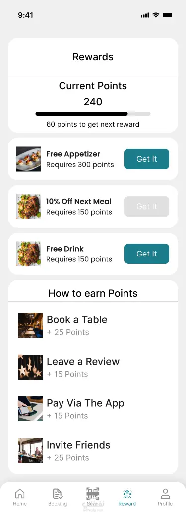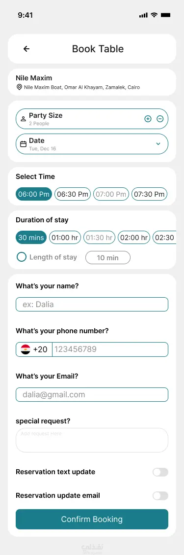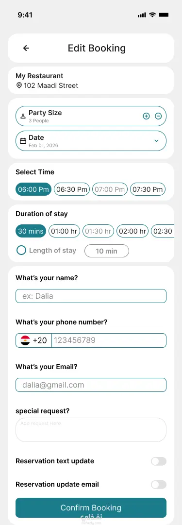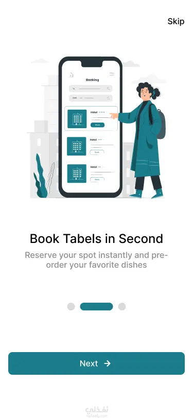 تطبيق لحجز طاولة في المطاعم بسهولة ودون الحاجة للانتظار. يتيح للمستخدم اختيار المطعم، تحديد عدد الأشخاص والوقت المناسب، مع إمكانية تعديل أو إلغاء الحجز (Cancel) بكل سهولة في أي وقت. يتميز التطبيق بواجهة بسيطة وسهلة الاستخدام تضمن تجربة سريعة وسلسة، بالإضافة إلى نظام إشعارات لتأكيد الحجز وتذكير المستخدم بموعده. كما يوفر التطبيق نظام نقاط (Points System) يحصل عليه المستخدم مع كل حجز، ويمكن استخدام هذه النقاط للحصول على خصومات في المرات القادمة.