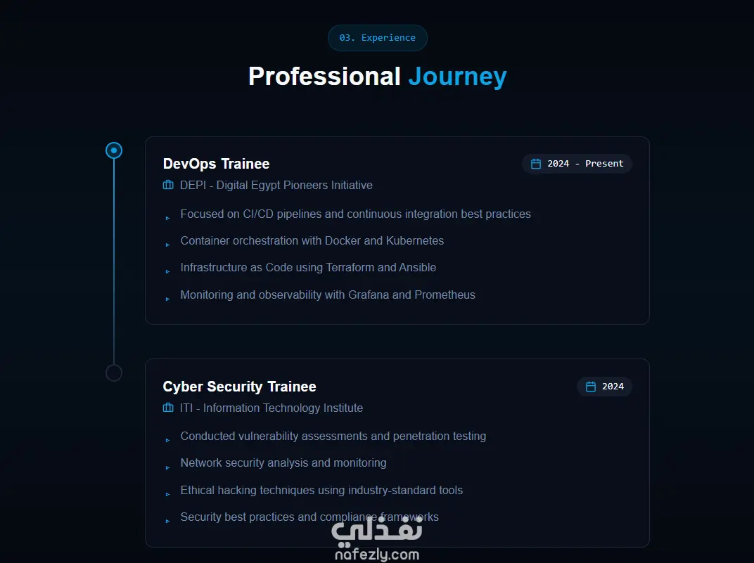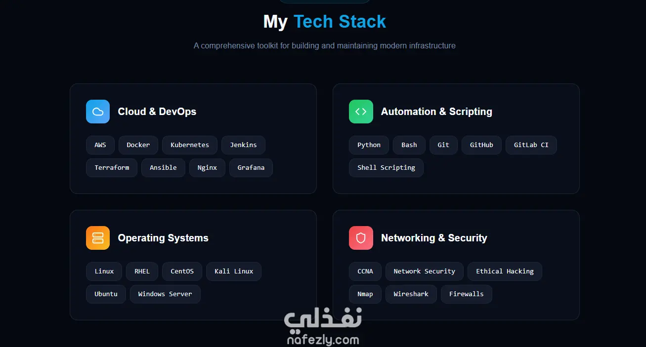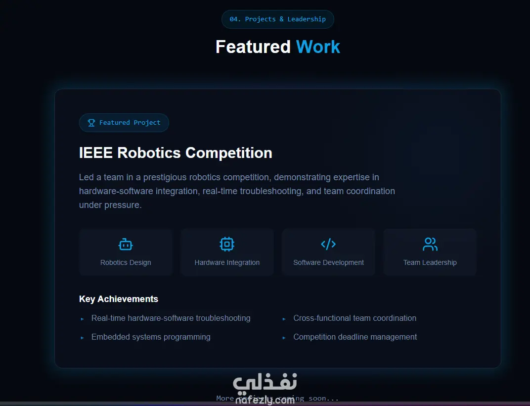 هل تبحث عن طريقة احترافية لعرض مهاراتك التقنية وأعمالك؟ سأقوم بتصميم بورفوليو إلكتروني عصري بنظام (One-Page Portfolio) يتميز بواجهة داكنة وجذابة تشبه المواقع العالمية. التصميم متوافق تماماً مع الجوال والحاسوب، ويشمل عرض خبراتك، مهاراتك التقنية (Tech Stack)، وأبرز مشاريعك بطريقة تفاعلية وسلسة .