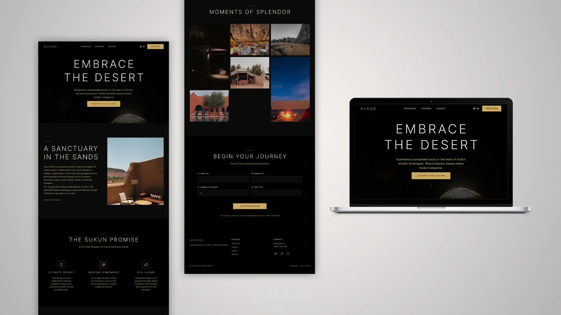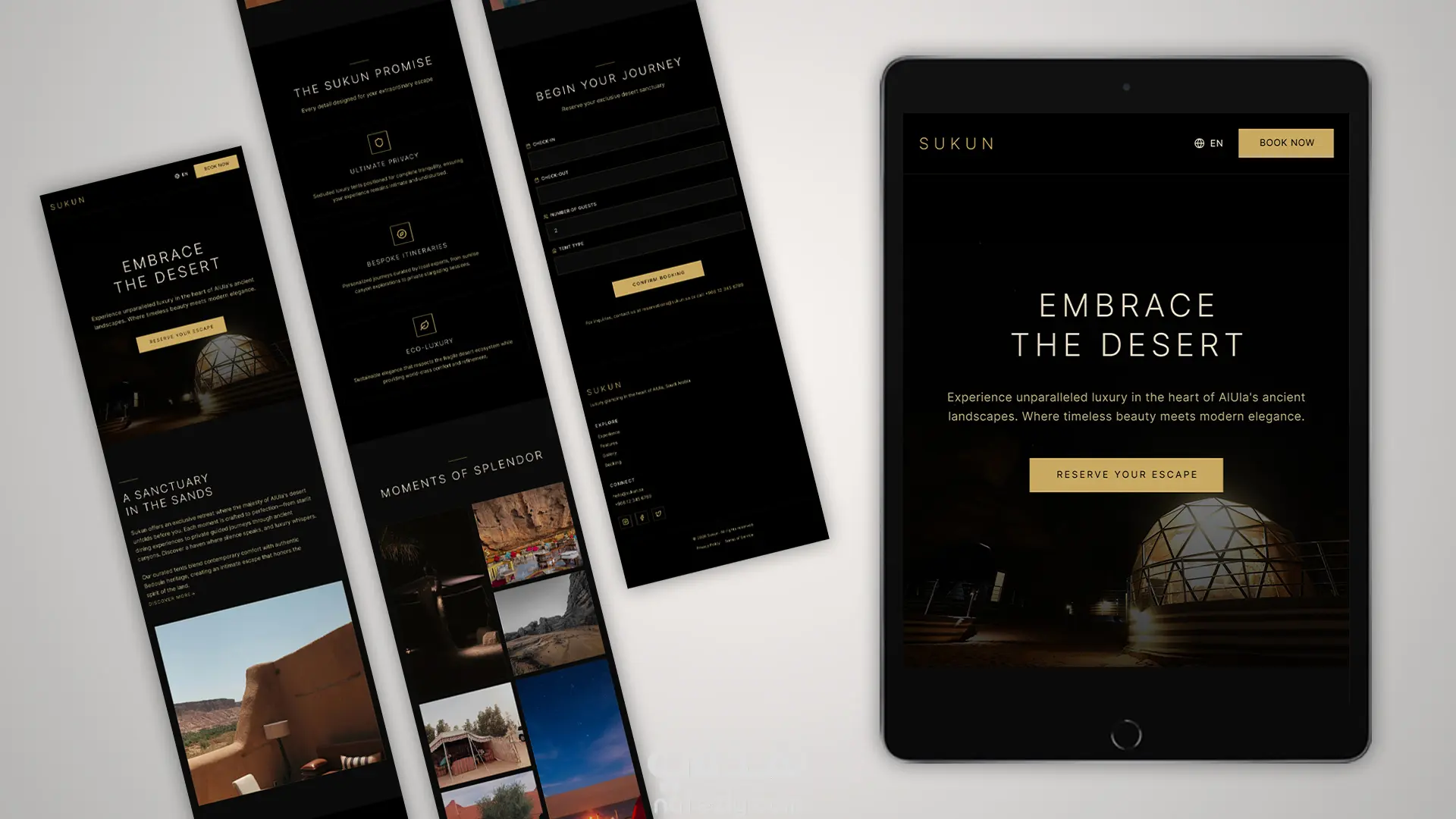 تصميم صفحة هبوط (Landing Page) لخدمات التخييم السياحي الفاخر في السعودية. التصميم بيعتمد على الـ Dark Mode مع ألوان مستوحاة من سحر صحراء العلا (الأسود والذهبي) عشان يعكس طابع الفخامة، الهدوء، والأصالة. أهم مميزات الشغل: تصميم عصري (Minimalist) بيريح العين ويبرز جمال الصور. واجهة متوافقة بالكامل مع اللغتين (عربي وإنجليزي). نموذج حجز (Booking Form) سريع ومباشر لتسهيل تجربة العميل. الأدوات: Figma.