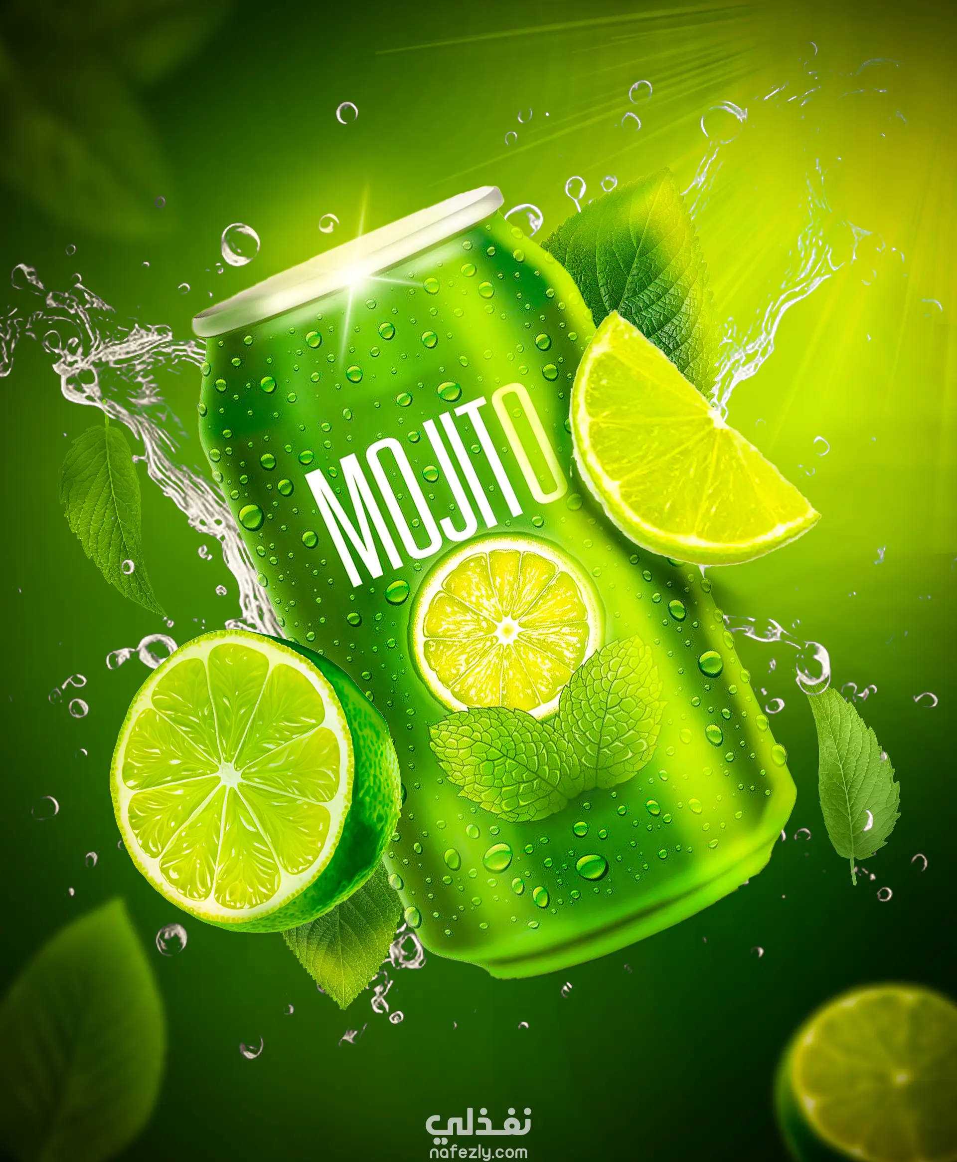 مؤثرات بصرية احترافية: إضافة قطرات الندى، الانفجارات المائية، وتأثيرات الحركة (Motion Blur) كما هو موضح في نموذج "الموهيتو" المرفق.