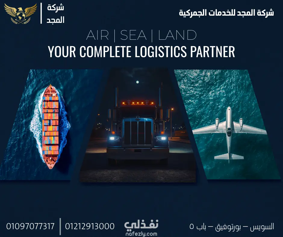 تصميم بوست دعائي احترافي لشركة المجد للخدمات الجمركية يعكس مفهوم الشريك اللوجستي المتكامل في الشحن البحري والبري والجوي.