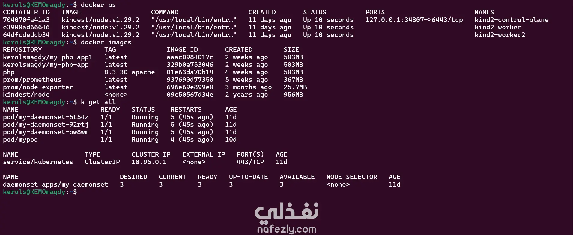 تنسيق الخدمات عبر Kubernetes: إعداد وإدارة العناقيد (Clusters) باستخدام kind، وتشغيل الـ Pods، وإدارة مجموعات الـ DaemonSets لضمان تشغيل التطبيقات على جميع عقد النظام.