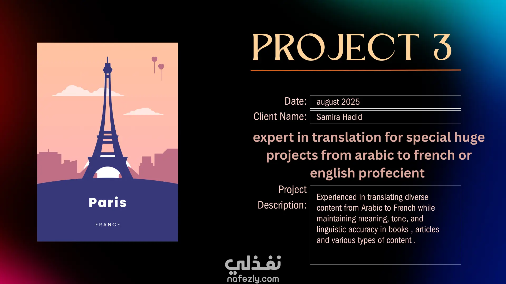 قمت بترجمة مقالة خاصة بعدد 1000 كلمة من اللغة العربية الي اللغة الفرنسية بأسلوب يدوي لائق متقن احترافي
