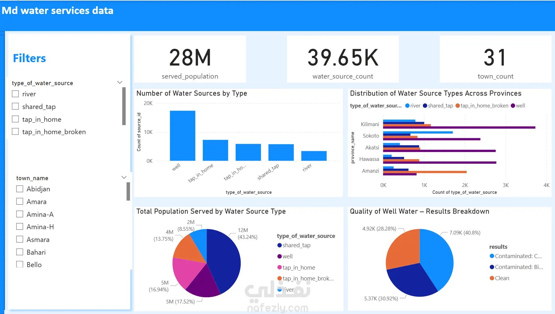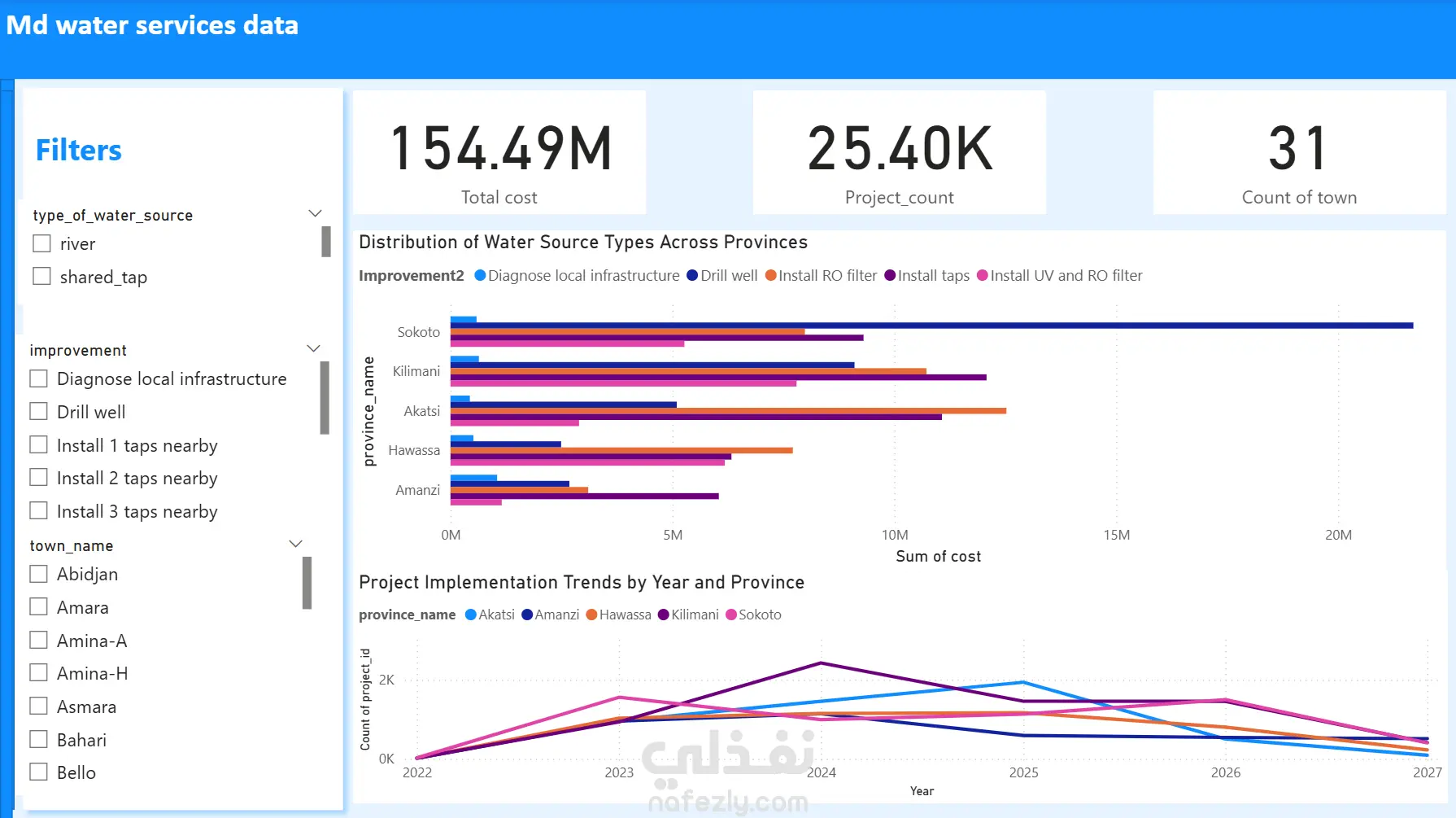 هذه لوحة Power BI تعرض تحليلاً شاملاً لمشروعات خدمات المياه، مع تتبع حالة مصادر المياه، الاحتياجات للتحسين، التكاليف، وتنفيذ المشاريع عبر المحافظات. 🟦 أبرز المقاييس (KPIs) إجمالي مصادر المياه: عدد المصادر الممسوحة. عدد المصادر التي تحتاج إصلاح: لتحديد الثغرات في البنية التحتية. عدد المصادر المحسنة: يوضح التقدم في تطوير المصادر. إجمالي تكلفة المشاريع: مجموع مصاريف المشاريع. عدد المشاريع المنفذة: عدد المشاريع المتميزة. عدد المدن المستفيدة: نطاق الوصول للمشروعات. 🔷 أهم الرسوم البيانية حالة مصادر المياه حسب النوع (صفحة 1) رسم بياني شريطي مكدس يوضح أي أنواع المصادر تحتاج اهتمام أكثر. خريطة مصادر المياه (صفحة 1) تعرض مواقع المصادر وحالتها جغرافياً. أنواع مصادر المياه حسب المحافظات (صفحة 2) رسم بياني شريطي أفقي يوضح توزيع التمويل وأنواع التحسينات لكل محافظة. اتجاه تنفيذ المشاريع حسب السنة والمحافظة (صفحة 2) رسم خطي يوضح نشاط المشاريع سنوياً في كل محافظة. 🔎 الفلاتر المتاحة نوع مصدر المياه (بئر، نهر، صنبور مشترك…) حالة الإصلاح نوع التحسين (تركيب صنابير، حفر آبار…) اسم المدينة والمحافظة 💡 طريقة الاستخدام استخدم الفلاتر لتضييق التحليل حسب نوع المصدر، التحسين، المدينة أو المحافظة. صفحة 1: التركيز على المصادر التي تحتاج إصلاح ومواقعها صفحة 2: تحليل توزيع التمويل، نوع التحسينات، واتجاه المشاريع السنوي.