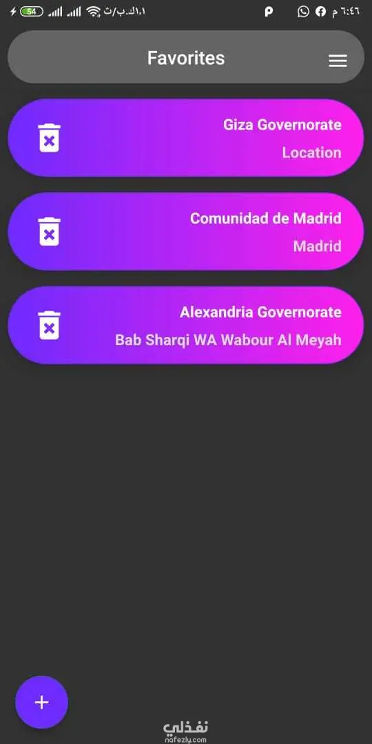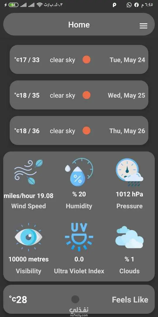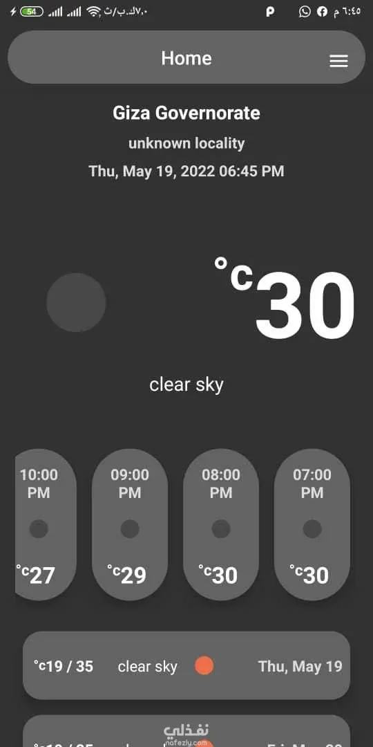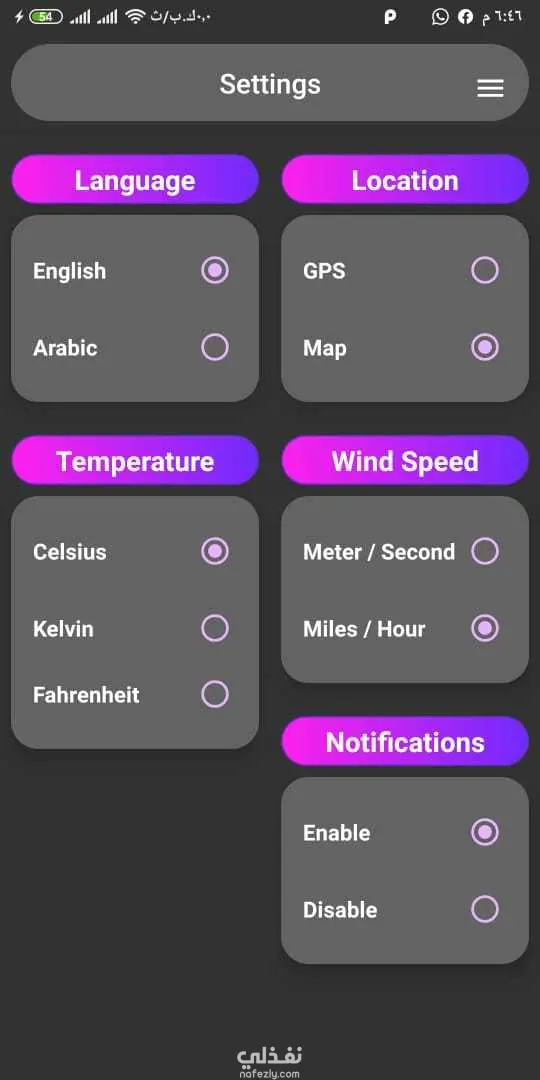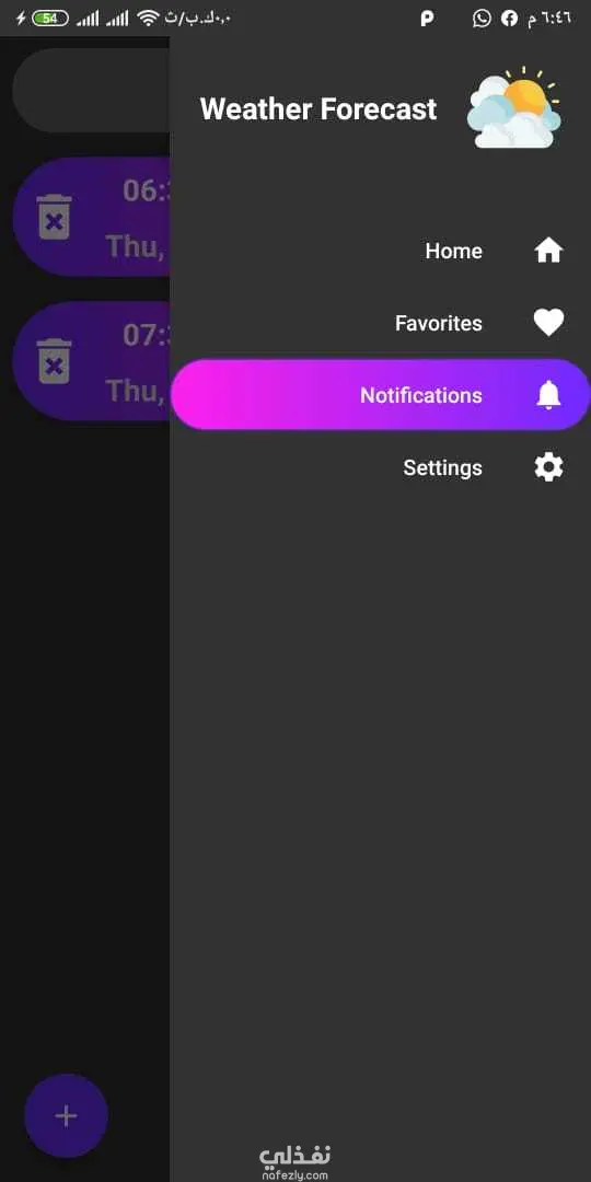 Displays the weather status and temperature from your location. You can pick a specific location on the map, search for a place and add it to a list of favorite locations to get weather information. You can set an alert for rain, wind, temperature, snow, …etc.
