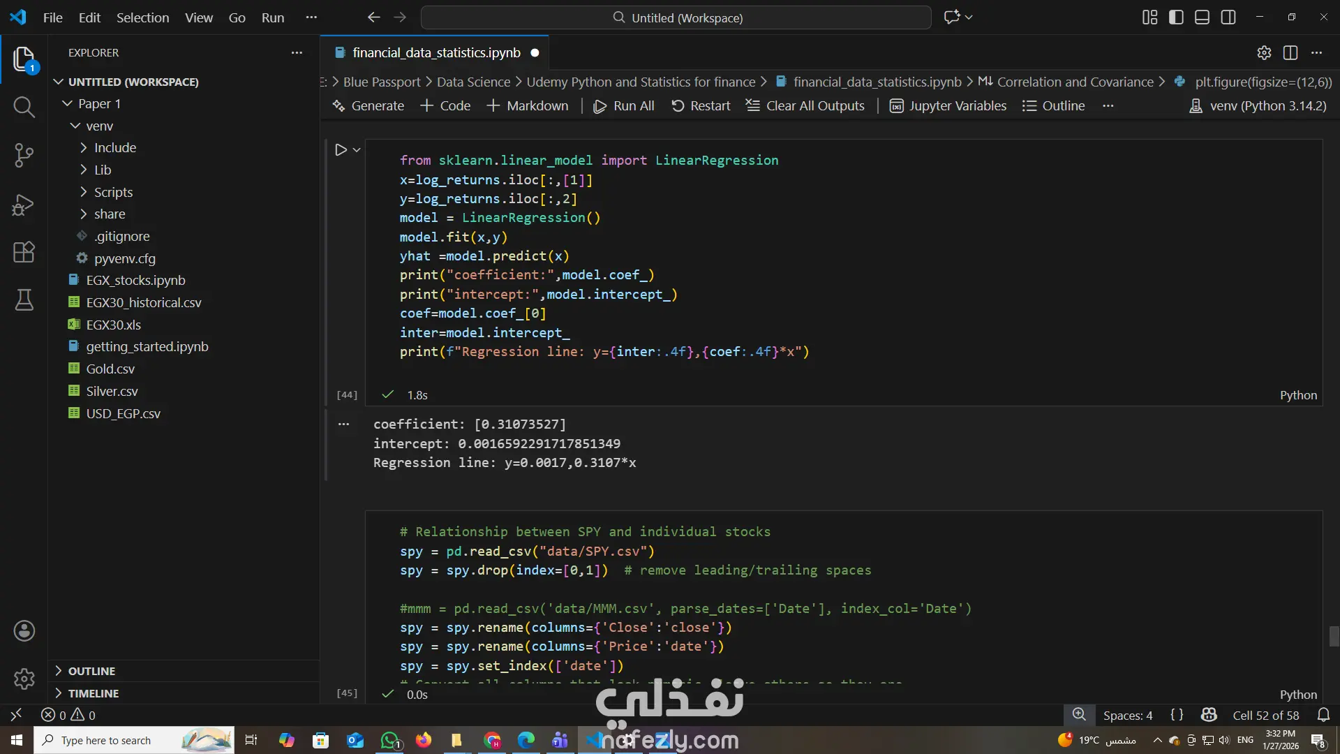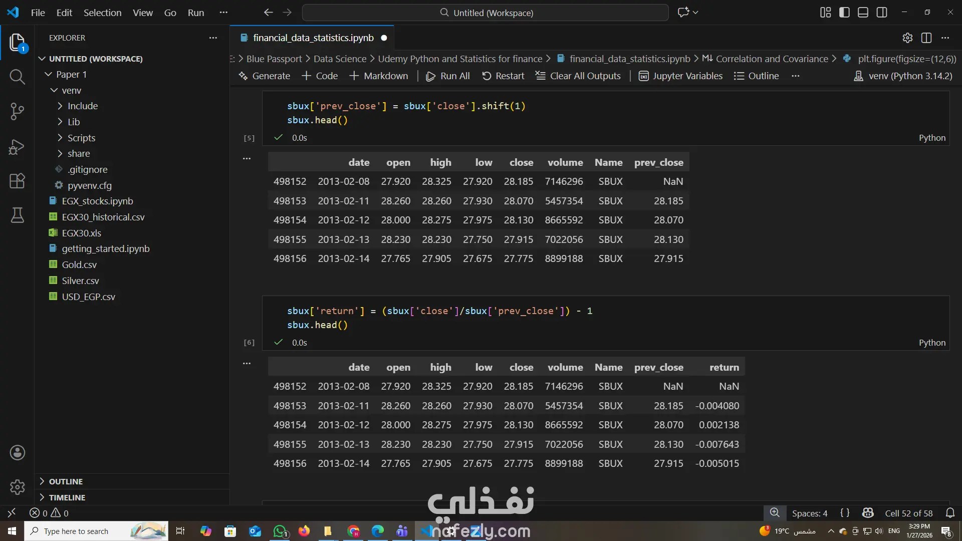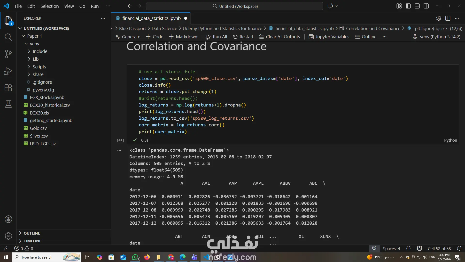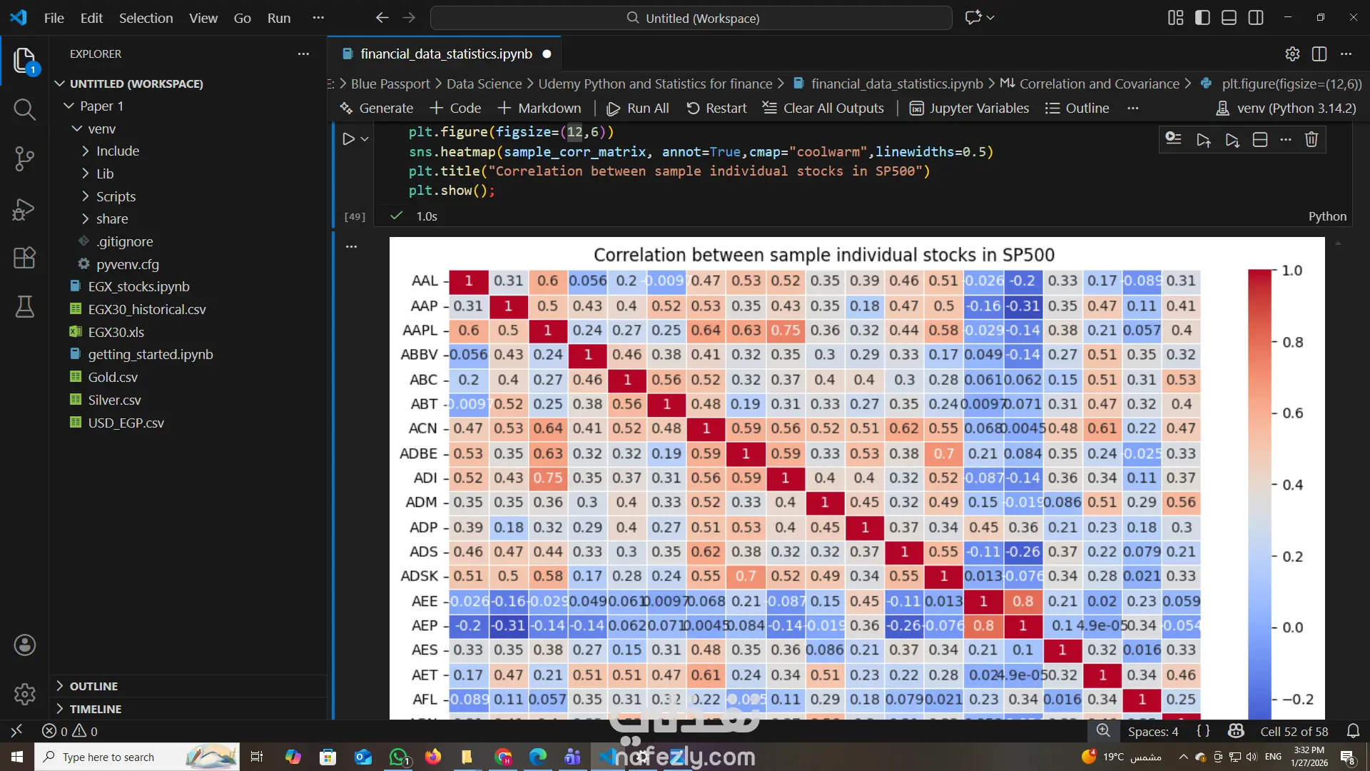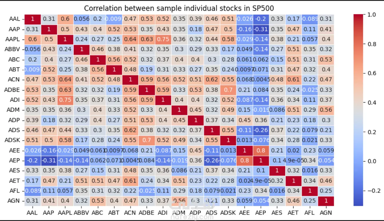 حساب معاملات الارتباط بين الأسهم باستخدام المصفوفات الحرارية (Heatmaps).