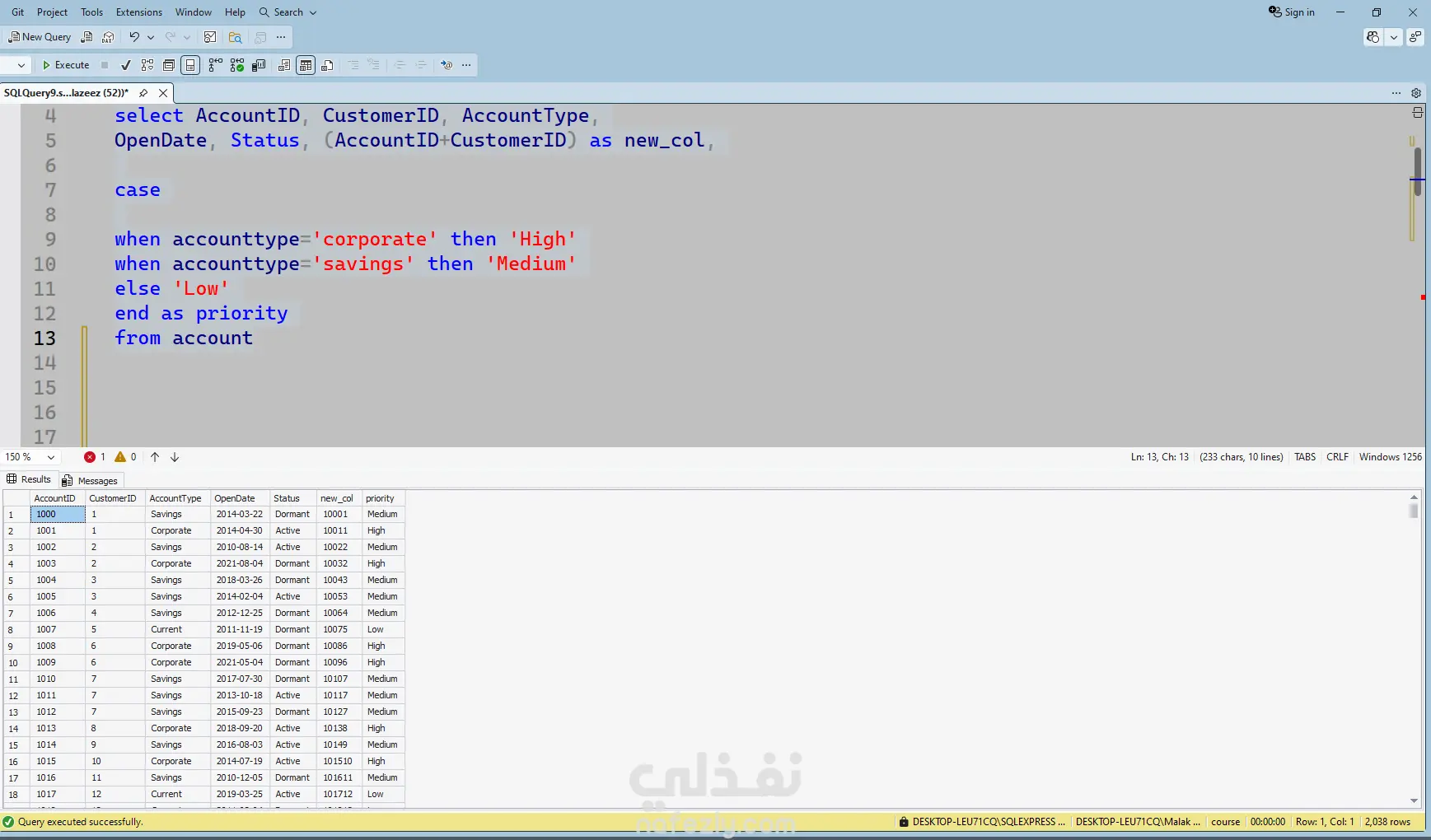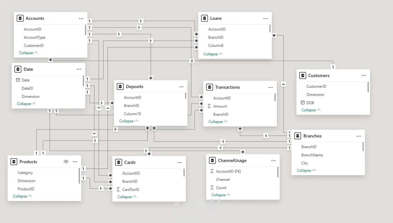 يربط المخطط بين هذه الكيانات من خلال علاقات دقيقة، حيث يتم ربط كل حساب بعميل محدد، وكل معاملة بحساب وفرع، كما يتم توثيق القروض والودائع والبطاقات ضمن الحسابات والفروع ذات الصلة. يتيح هذا النموذج تنظيم البيانات البنكية بشكل هيكلي، ويساعد في إعداد تقارير دقيقة، وتحليل سلوك العملاء، ودعم أدوات ذكاء الأعمال لاتخاذ قرارات أكثر فاعلية.