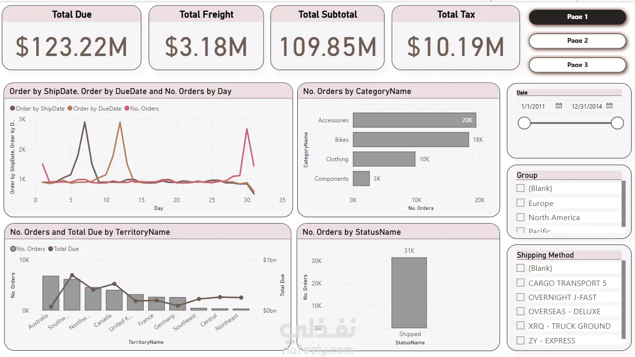 أداء المبيعات - أدفنتشر وركس تقرير متعدد الصفحات مُستند إلى قاعدة بيانات SQL Server الخاصة بأدفنتشر وركس 2022، يُغطي 31 ألف طلب، وإجمالي مستحقات بقيمة 123.22 مليون دولار، وشحن 275 ألف منتج. الصفحة 1 - نظرة عامة: مؤشرات الأداء الرئيسية مع جدول زمني يومي للطلبات (تاريخ الشحن مقابل تاريخ الاستحقاق)، وتفصيل حسب الفئات (إكسسوارات 20 ألف، دراجات 18 ألف، ملابس 10 آلاف)، ومخطط أداء المناطق، وأداة تصفية البيانات للفترة من 2011 إلى 2014 مع فلاتر حسب المنطقة والشحن. الصفحة ٢ - خريطة المناطق: خريطة فقاعية عالمية توضح حجم الطلبات حسب المنطقة، ومخطط دائري للمجموعات الإقليمية (أمريكا الشمالية ٥١٪، أوروبا ٢٧٪، المحيط الهادئ ٢٢٪)، ومقارنة بين طرق الشحن: XRQ Truck Ground و Cargo Transport 5. الصفحة ٣ - مندوبو المبيعات: تصنيف أفضل ١٠ مندوبي مبيعات حسب إجمالي الإيرادات - تتصدر ليندا ميتشل القائمة بإيرادات بلغت ٠.٣٨ مليار دولار - مع إمكانية البحث عن الاسم الكامل وطريقة الشحن لتحليل معمق.
