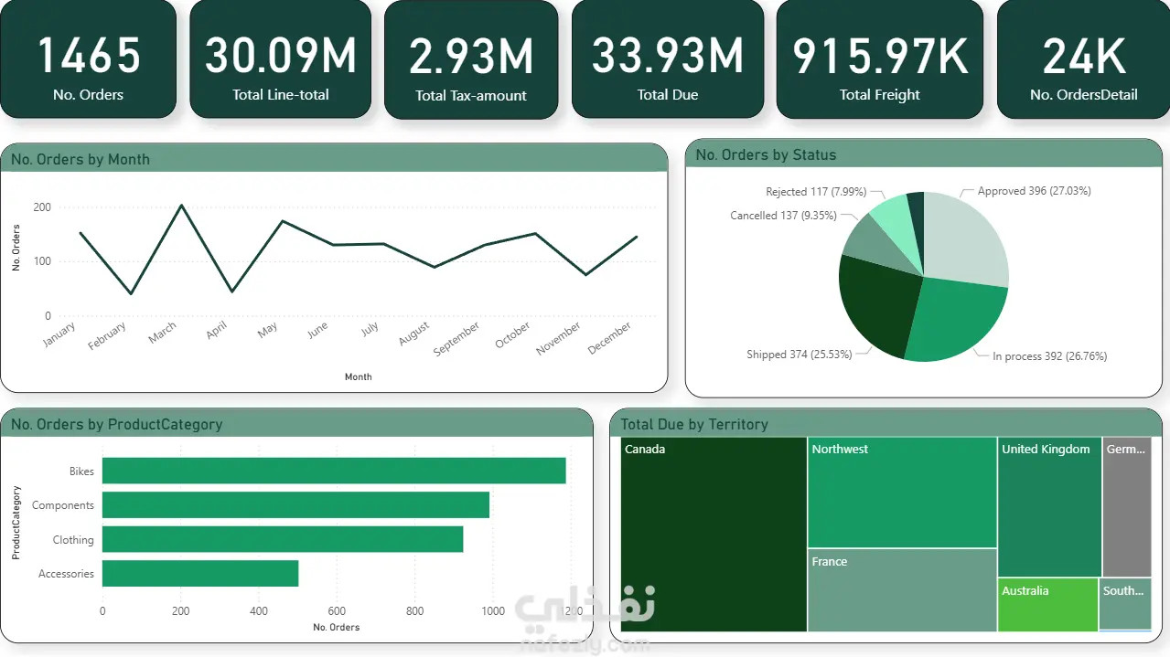 لوحة بيانات مبيعات الدراجات لوحة بيانات شاملة لتحليل مبيعات شركة بيع دراجات بالتجزئة، تتابع 1465 طلبًا بقيمة إجمالية مستحقة قدرها 33.93 مليون دولار. يقدم التقرير نظرة شاملة على أداء الشركة من خلال أربعة رسوم بيانية رئيسية: اتجاهات الطلبات الشهرية التي تكشف عن ذروة المواسم، وتفصيل لحالة الطلبات (موافق عليها 27%، قيد التنفيذ 27%، تم شحنها 26%، ملغاة 9%)، وأداء فئات المنتجات مع تصدر الدراجات القائمة بأكثر من 1200 طلب، وخريطة إيرادات المناطق الجغرافية التي تغطي كندا، وشمال غرب الولايات المتحدة الأمريكية، والمملكة المتحدة، وفرنسا، وأستراليا.