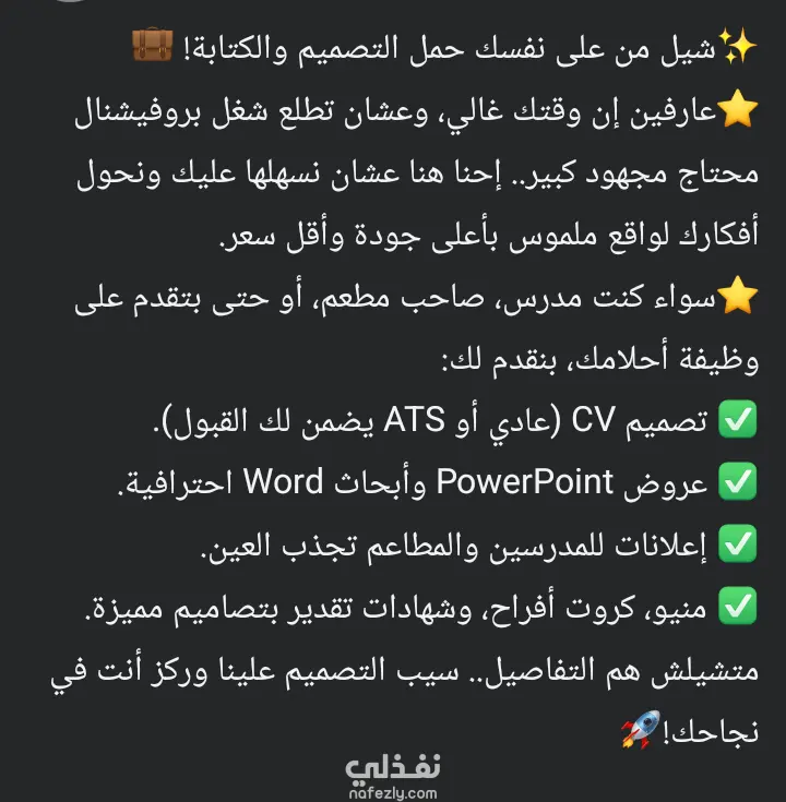 هل تبحث عن حضور رقمي متكامل يجمع بين الاستراتيجية التسويقية والتصميم الإبداعي؟ أقدم لك حلولاً شاملة لإدارة حساباتك وتطويرها من الألف إلى الياء تشمل : - تصميم صور البوستات . - كتابه محتوى جذاب . - اداره الحسابات وجدوله البوستات لضمان أعلى مشاهده .