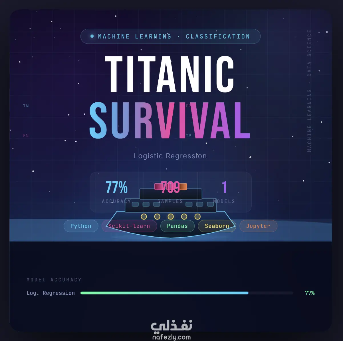 اشتغلت على titanic dataset واول حاجه نظفت الداتا من ال missing values , حذفت ال duplicates الاسطر المتكرره (rows) وحذفت ال outliers من الداتا لانها بتاثر على الداتا. عملت visualization باستخدام ال matplotlib and seaborn وبعدين دربت ال model على ال data ال classification model باستخدام مكتبه scikit learn طبعا بقسم ال data ل Train , Test ودرب الموديل على الداتا وبعدين اشوف اقارن ال predict بال actual عشان احسب ال accuracy ال accuracy طلعت ب %77 على ال test و %80 على ال train