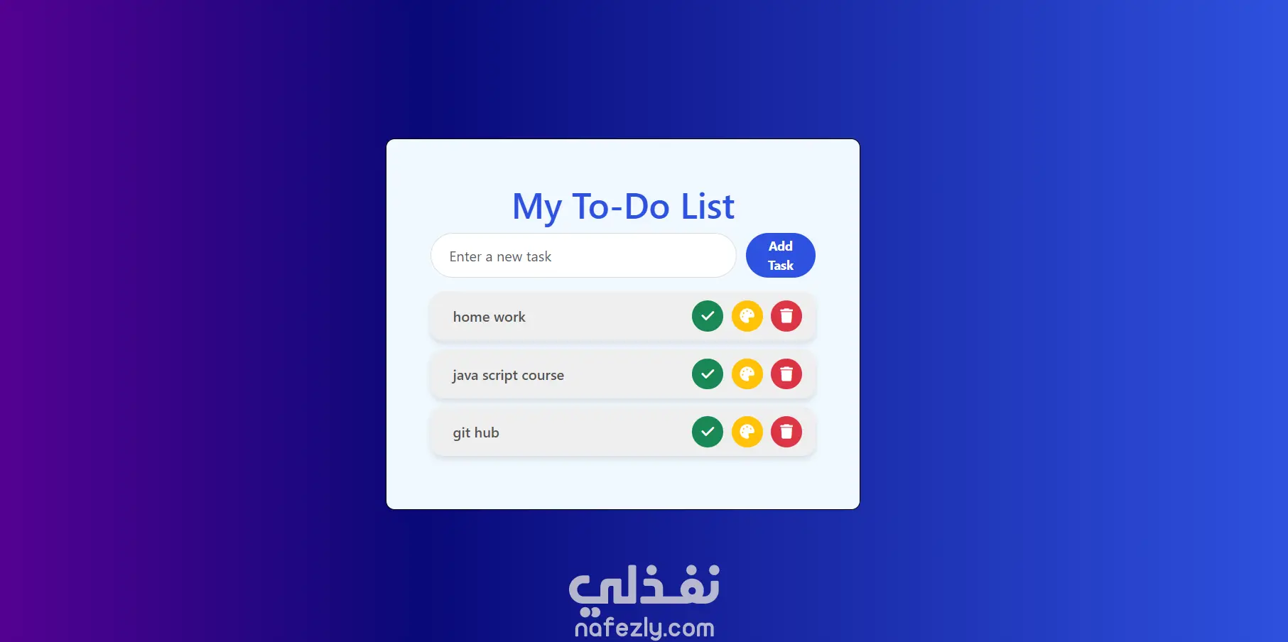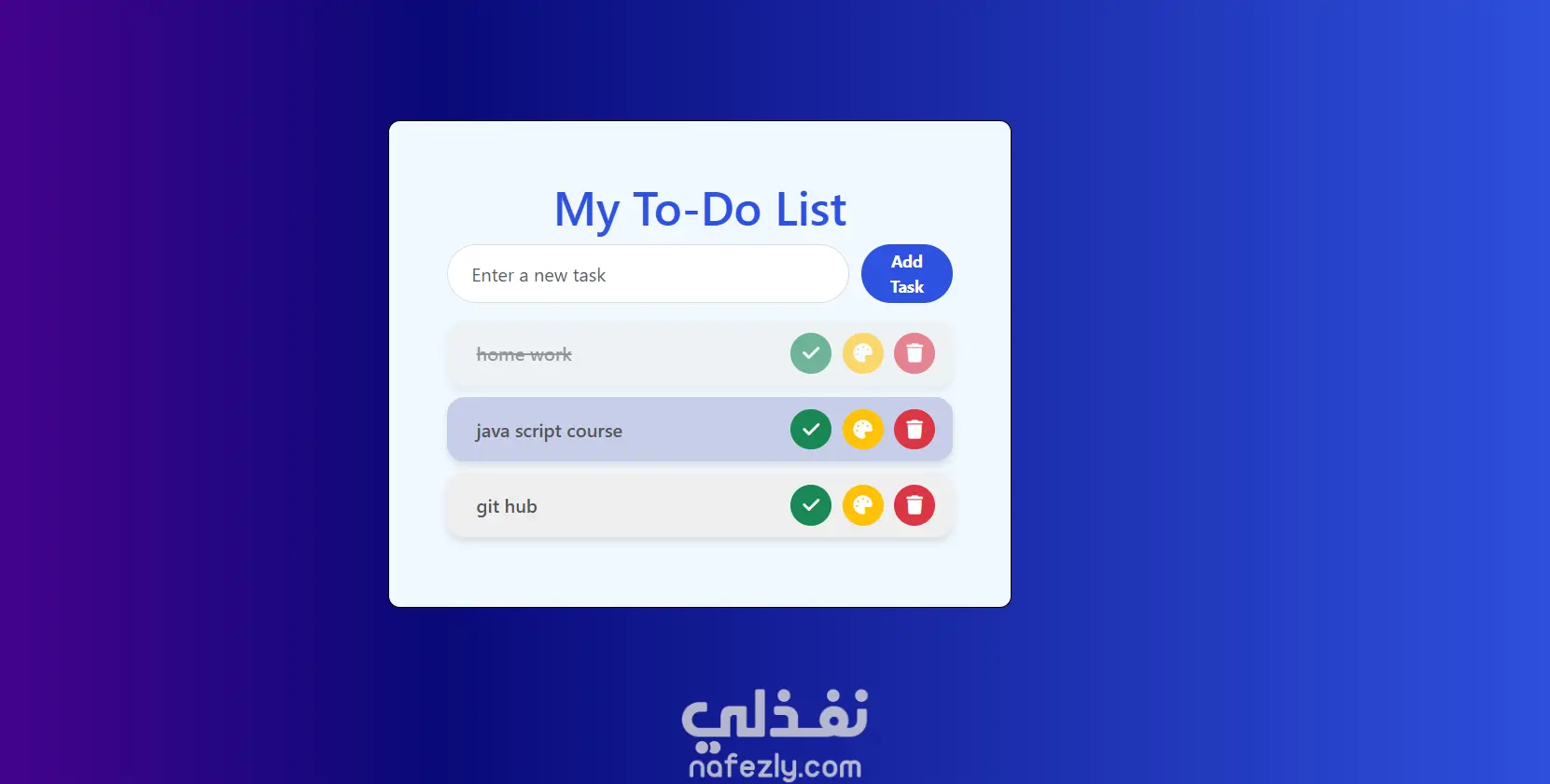 complete button: marks the task as completed change color button : change color of the task according to priority Delete button: delete the task from the list