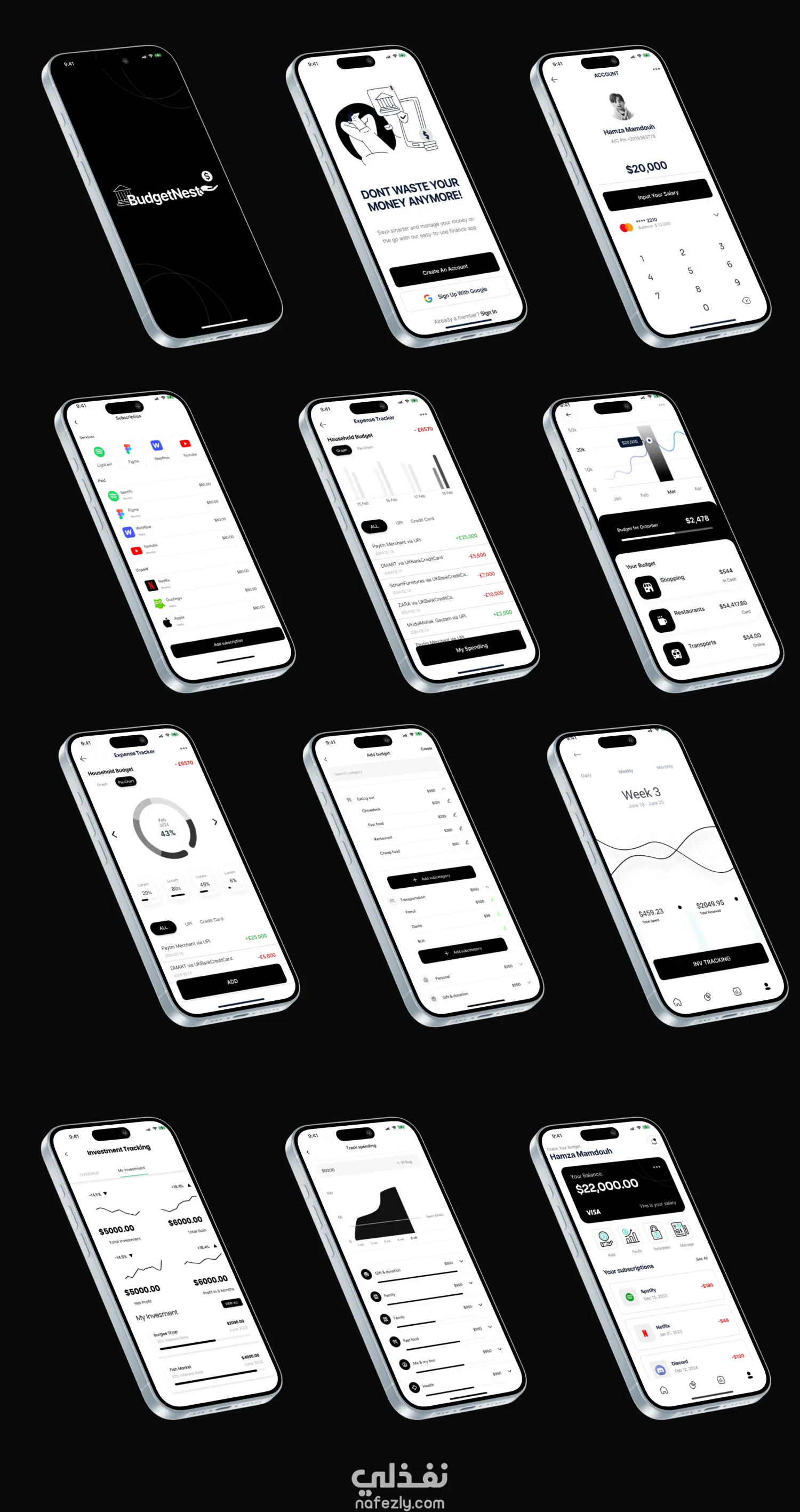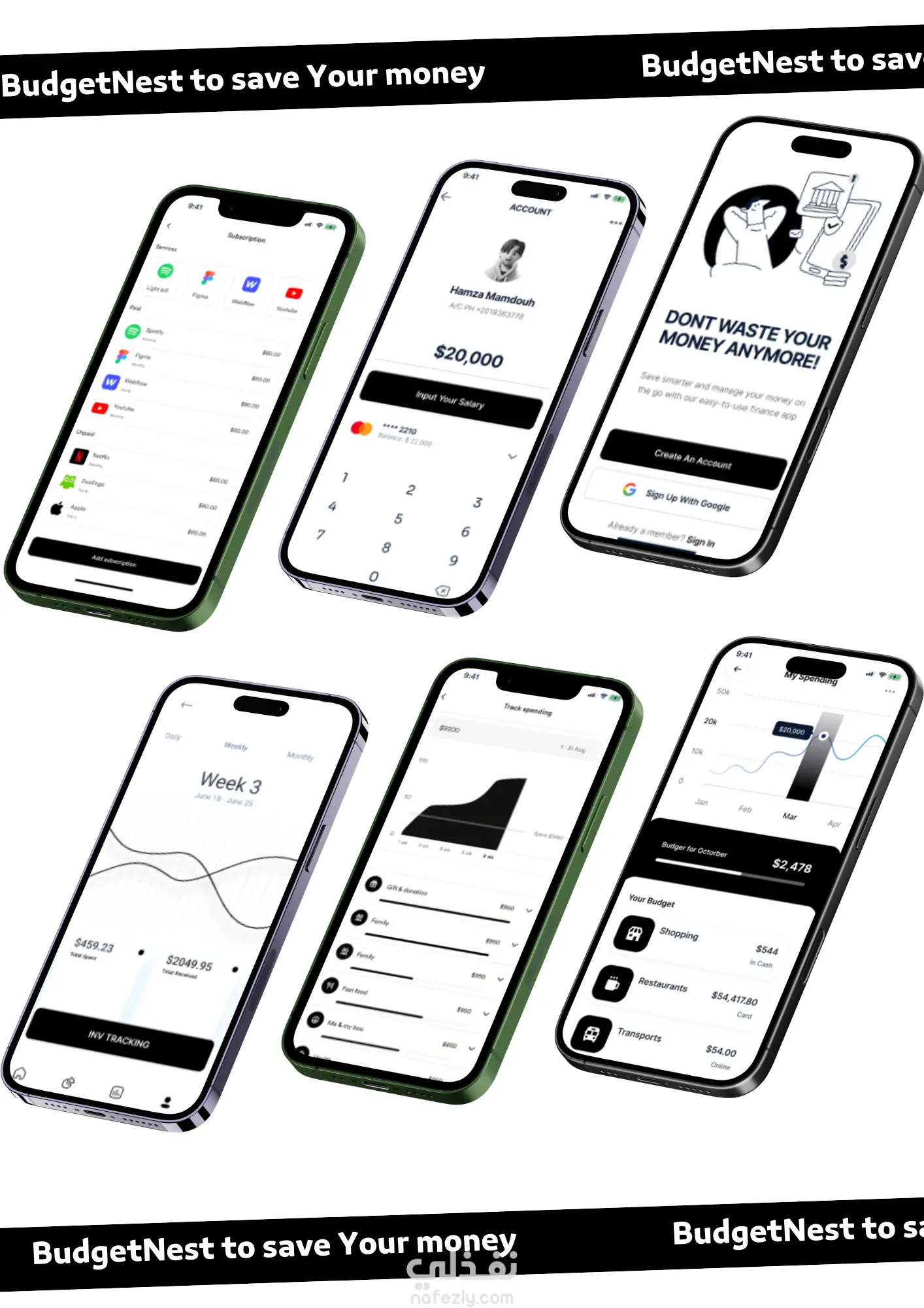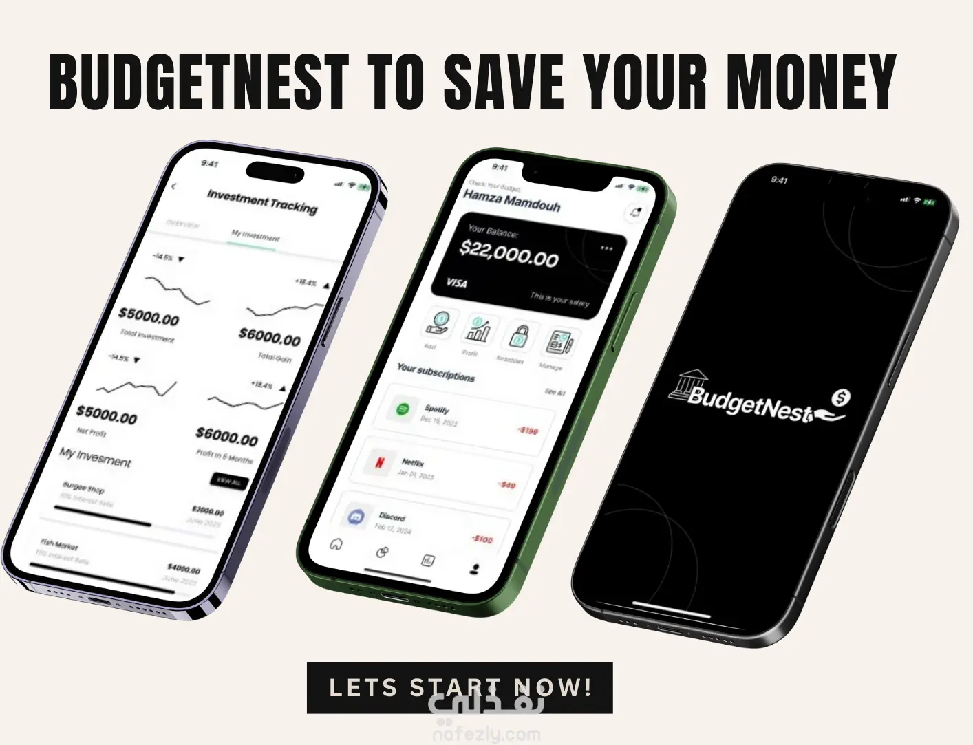 تصميم UI/UX لتطبيق BudgetNest لإدارة المصاريف وتتبع الميزانية