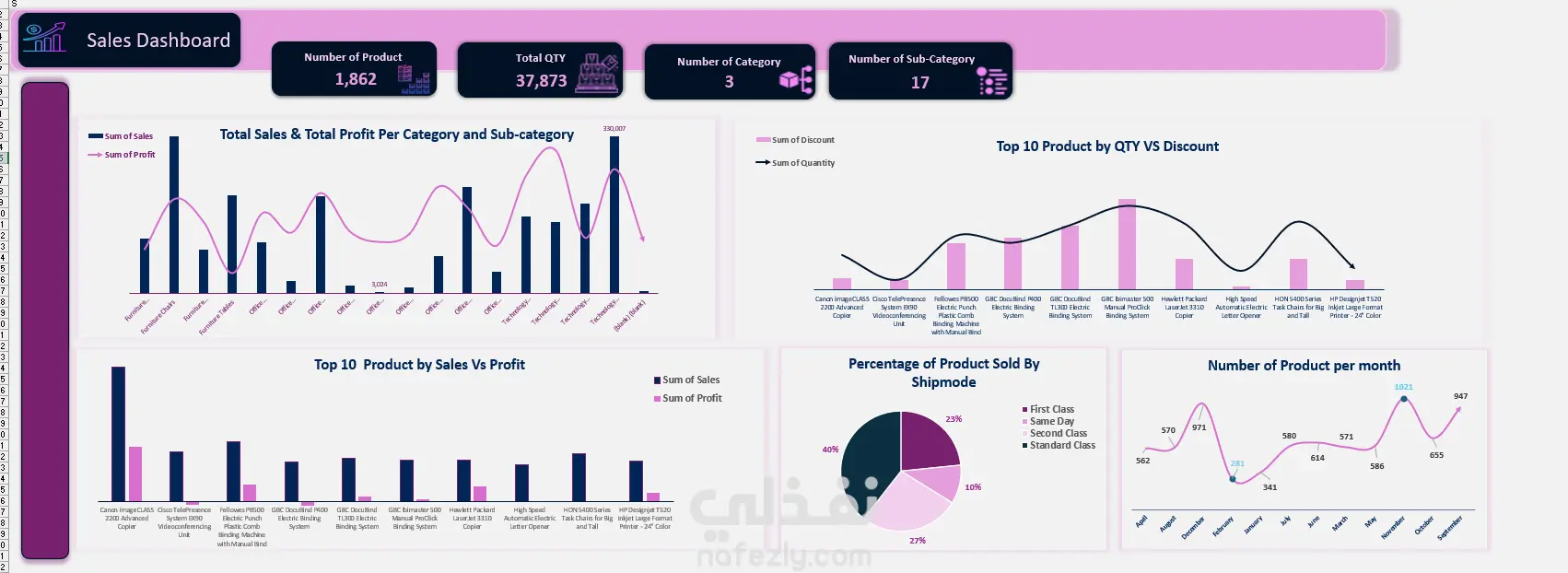 "الداشبورد التفاعلية دي معمولة مخصوص عشان نحلل أداء المنتجات بمختلف أنواعها وتصنيفاتها. ركزنا فيها على الأرقام الحيوية (الـ KPIs)، وعرضنا أكتر منتجات بتحقق مبيعات، وازاي الخصومات بتأثر على حركة البيع، وتوزيعه الشحنات ماشية ازاي، ده غير تتبع حركة المبيعات شهر بشهر. الهدف من المشروع كان إننا نطلع بـ 'Insights' (رؤى) واضحة عن مكاسبنا، وحجم الطلب على المنتجات، وازاي الخصم بيزود الكميات اللي بتتباع؛ وكل ده عشان القرارات اللي بناخدها في الشغل تكون مبنية على أرقام وحقائق مش مجرد توقعات."