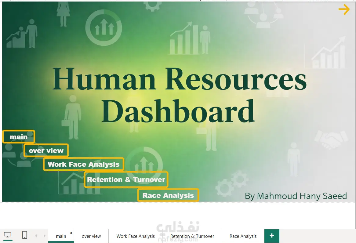 لوحة مؤشرات تفاعلية متطورة صُممت لتحويل بيانات الموارد البشرية الخام إلى رؤى استراتيجية. تهدف اللوحة إلى مراقبة أداء القوى العاملة، تحليل التنوع العرقي والجنسي، وتتبع معدلات دوران الموظفين (Turnover) لدعم اتخاذ قرارات مدروسة في إدارة رأس المال البشري. أبرز مهارات تحليل البيانات في هذا المشروع:نظرة عامة على القوة العاملة (Workforce Overview): تتبع المؤشرات الرئيسية مثل إجمالي الموظفين (22 ألف موظف)، الموظفين الحاليين (19 ألف)، وحالات الاستقالة أو الإنهاء (3 آلاف). تحليل الديموغرافيا والتنوع:تحليل النوع الاجتماعي: (ذكور 50.81%، إناث 46.46%). تحليل الأعراق (Race Analysis): تقديم توزيع دقيق للموظفين حسب العرق، حيث يمثل البيض (White) النسبة الأكبر بـ 28.49%. تحليل الاحتفاظ والتعثر (Retention & Turnover):رصد معدلات ترك العمل حسب الأقسام، حيث سجل قسم الهندسة (Engineering) أعلى معدل بـ 862 حالة. مقارنة الاستقرار الوظيفي بين العمل من المقر (Headquarters) والعمل عن بُعد (Remote). تحليل زمني لحالات إنهاء الخدمة (Terminated by Year) لرصد الاتجاهات عبر السنوات.تحليل الوظائف (Work Face Analysis): عرض لأكثر الوظائف طلباً في المؤسسة وتوزيع الموظفين حسب الفئات العمرية والدرجات الوظيفية. الشمولية: الداشبورد لا يكتفي بالأرقام العامة، بل يغوص في تفاصيل المواقع الجغرافية (State/City) والأقسام. واجهة المستخدم (UI): استخدامك للألوان والرسوم البيانية (Donut Charts, Bar Charts, Maps) يجعل قراءة البيانات المعقدة سهلة جداً. التفاعلية: وجود فلاتر (Slicers) للأقسام، الجنس، الحالة الوظيفية، والأعراق يسمح للمستخدم بتخصيص العرض حسب حاجته