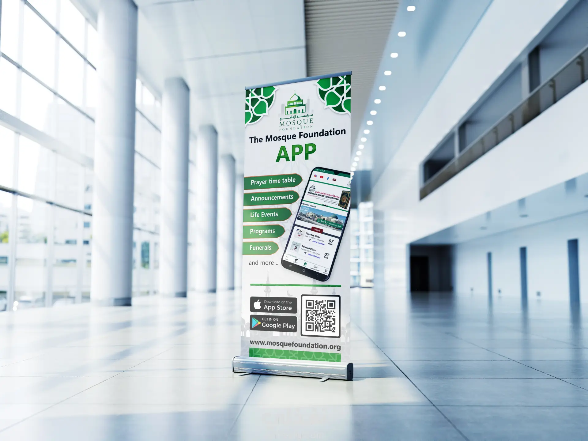 تصميم رول أب إعلاني للتعريف بتطبيق مؤسسة المسجد (Mosque Foundation App)، حيث يهدف التصميم إلى إبراز أهم خدمات التطبيق وتسهيل وصول المستخدمين إليه.