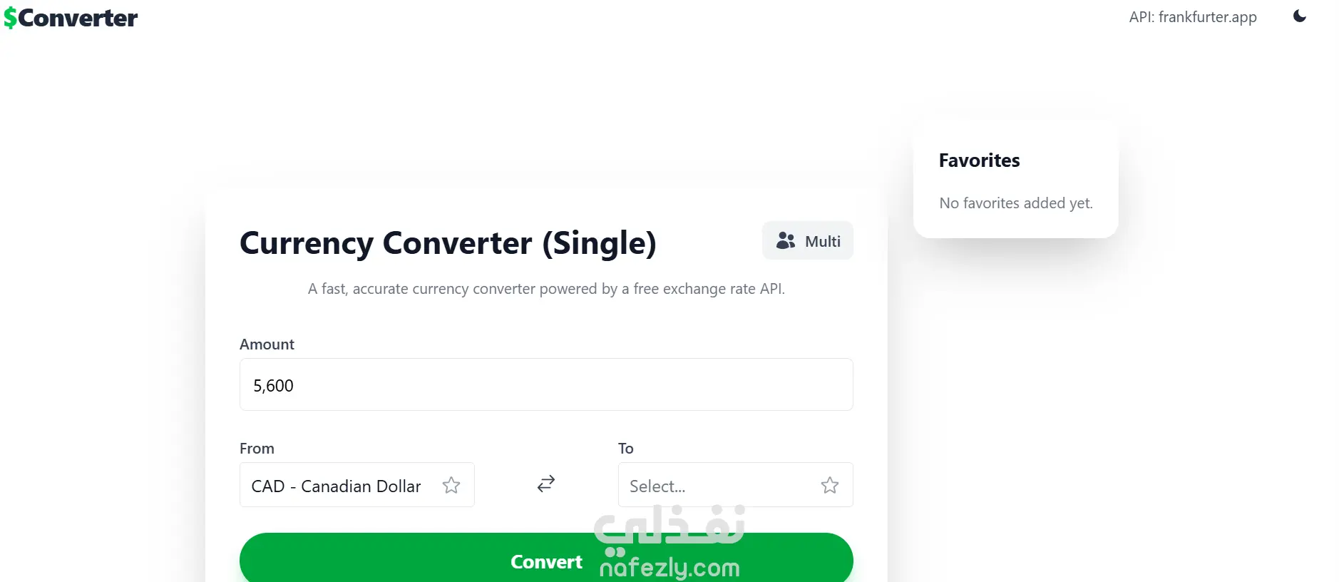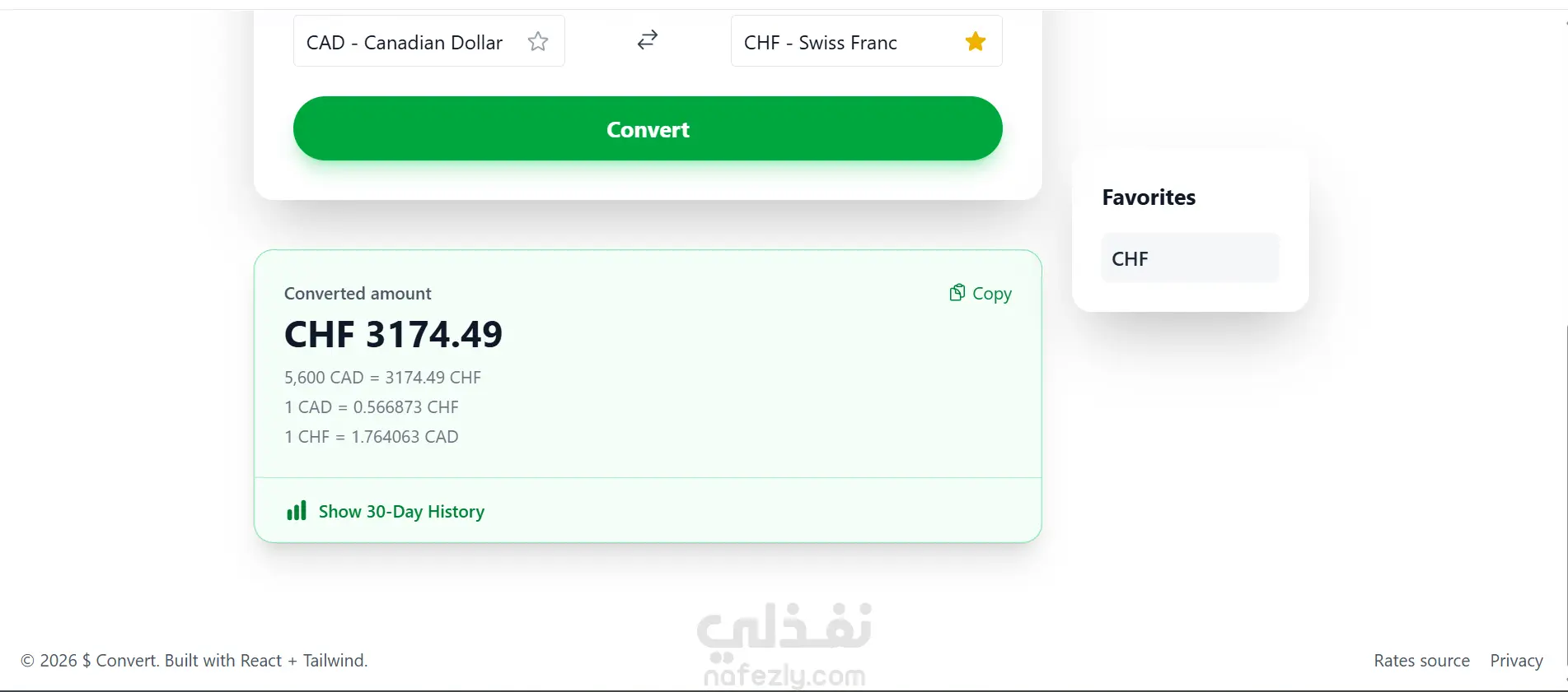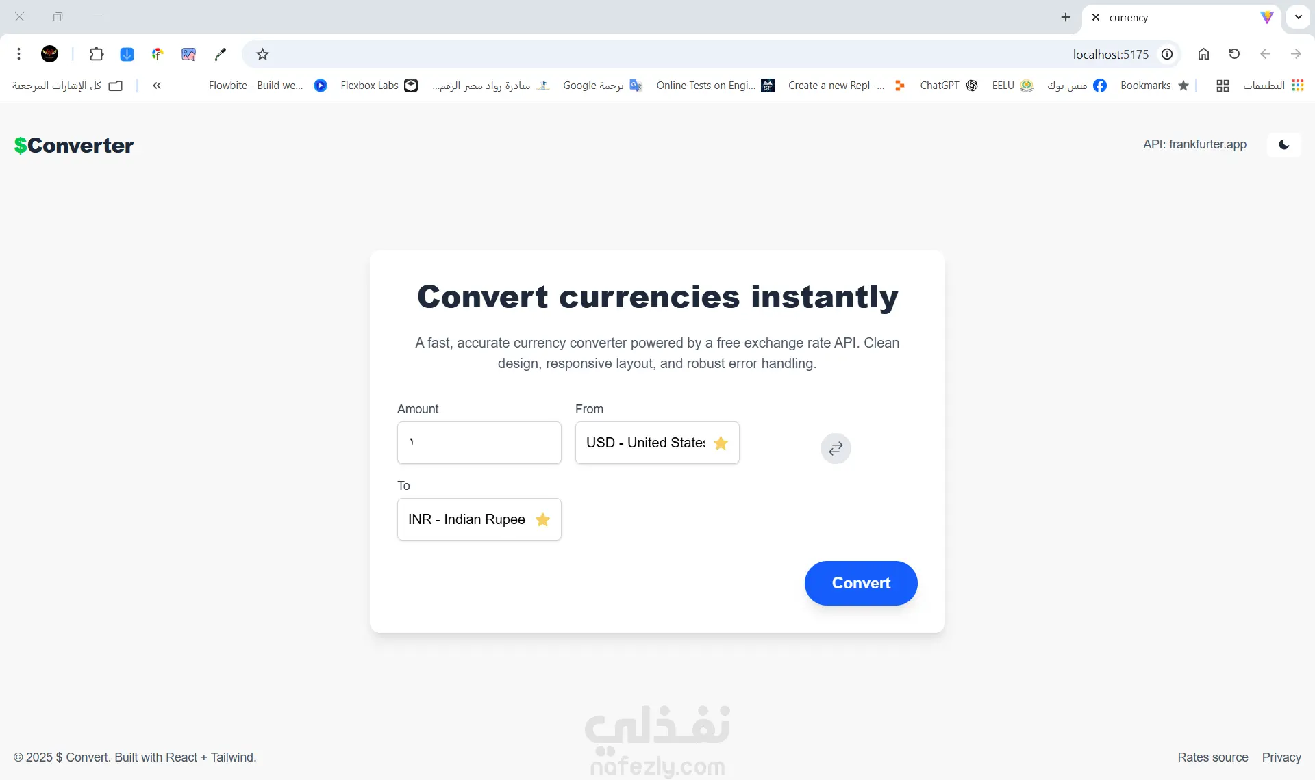 A modern and feature-rich currency converter application built with React, Vite, and Tailwind CSS. It allows users to convert amounts between various currencies, view historical exchange rates, manage favorite currencies, and more, using the free frankfurter.app API.