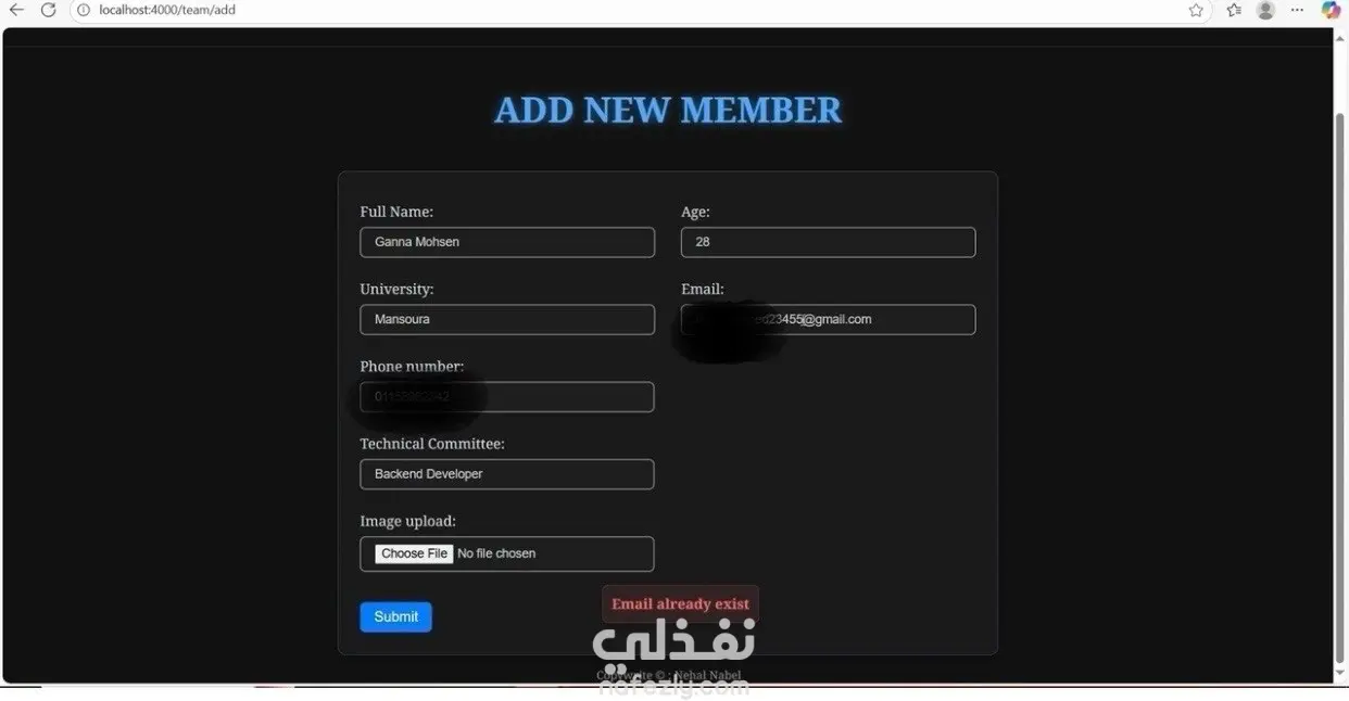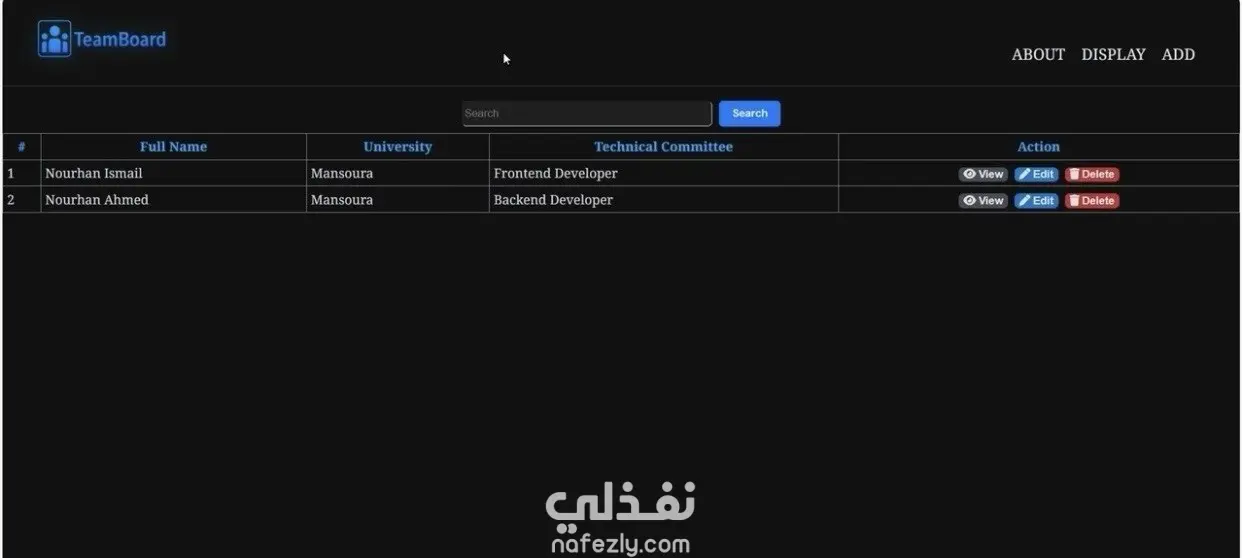 يتضمن المشروع نظام بحث بالاسم، والتحقق من فريدية البريد الإلكتروني لمنع التكرار، مع رسائل تنبيه (Success / Error) لعرض حالة العمليات للمستخدم.