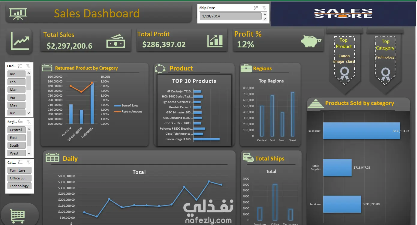 "قمت بتصميم وتطوير لوحة تحكم (Dashboard) احترافية لتحليل مبيعات متجر شامل، بهدف تحويل البيانات الخام إلى رؤى تجارية (Insights) قابلة للتنفيذ. أهم مميزات المشروع: تحليل المؤشرات الرئيسية (KPIs): عرض إجمالي المبيعات ($2.29M)، إجمالي الأرباح ($286K)، ونسبة الربح (12%). تحليل المنتجات والأصناف: تحديد أفضل 10 منتجات مبيعاً وأكثر الفئات تحقيقاً للأرباح (مثل فئة الـ Technology). التحليل الجغرافي: توزيع المبيعات حسب المناطق (West, East, Central, South). تحليل المرتجعات: ربط كمية المبيعات بنسبة المرتجعات لكل فئة لتقليل الخسائر. تفاعلية كاملة: إمكانية تصفية البيانات (Slicers) حسب التاريخ، المنطقة، ونوع المنتج للحصول على تفاصيل دقيقة. التصميم: تم استخدام واجهة Dark Mode احترافية لسهولة القراءة والتركيز على الأرقام الهامة."