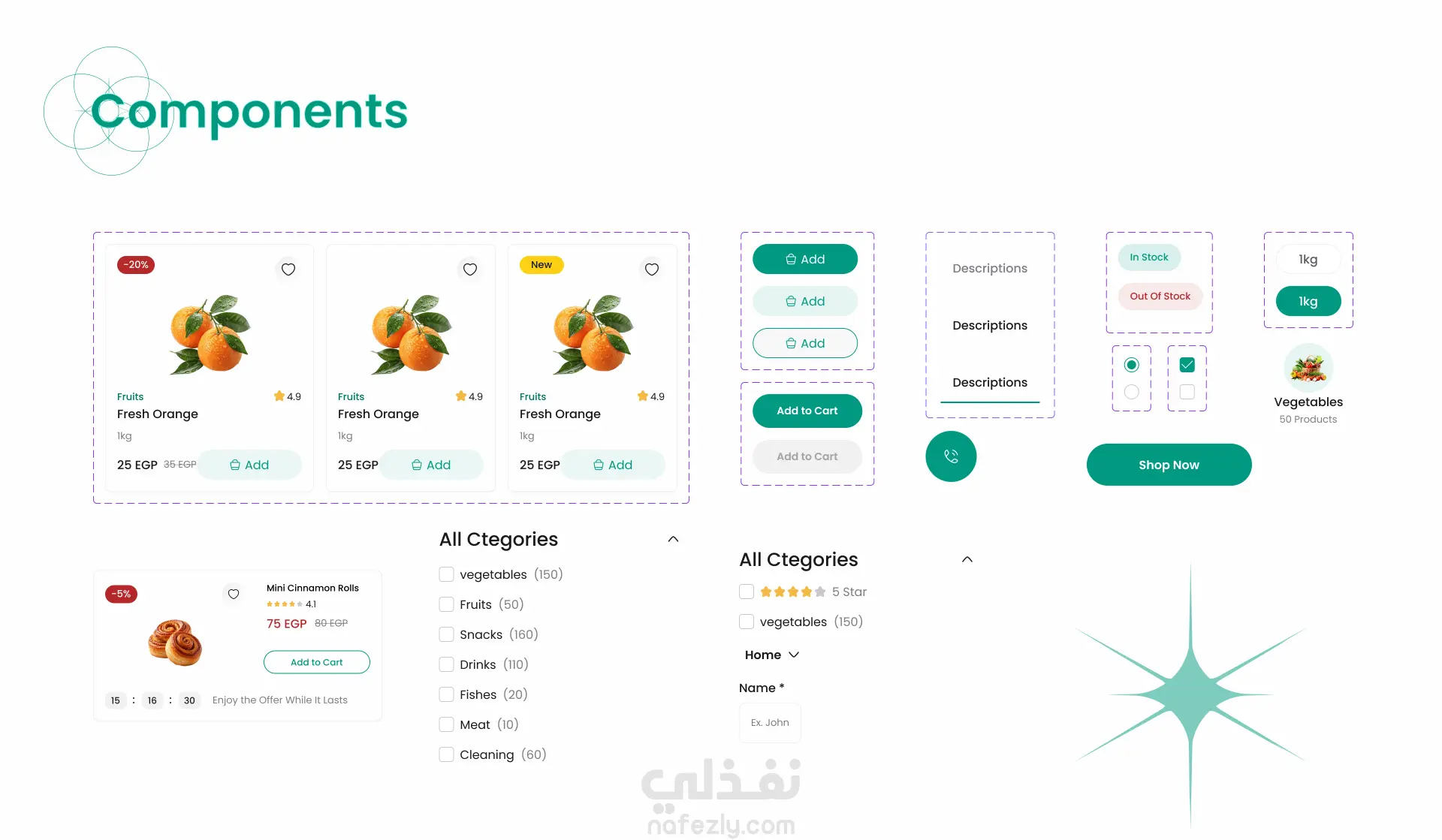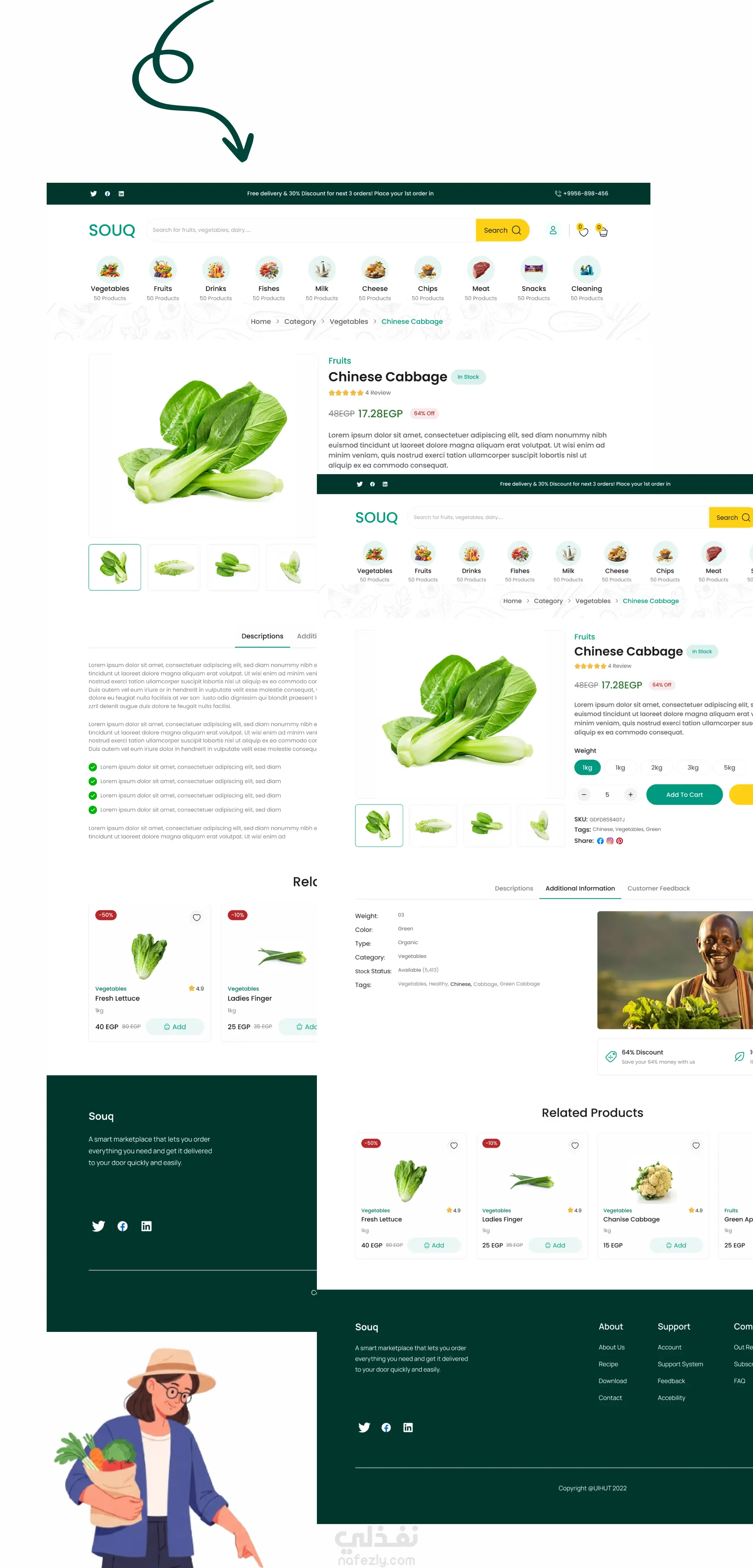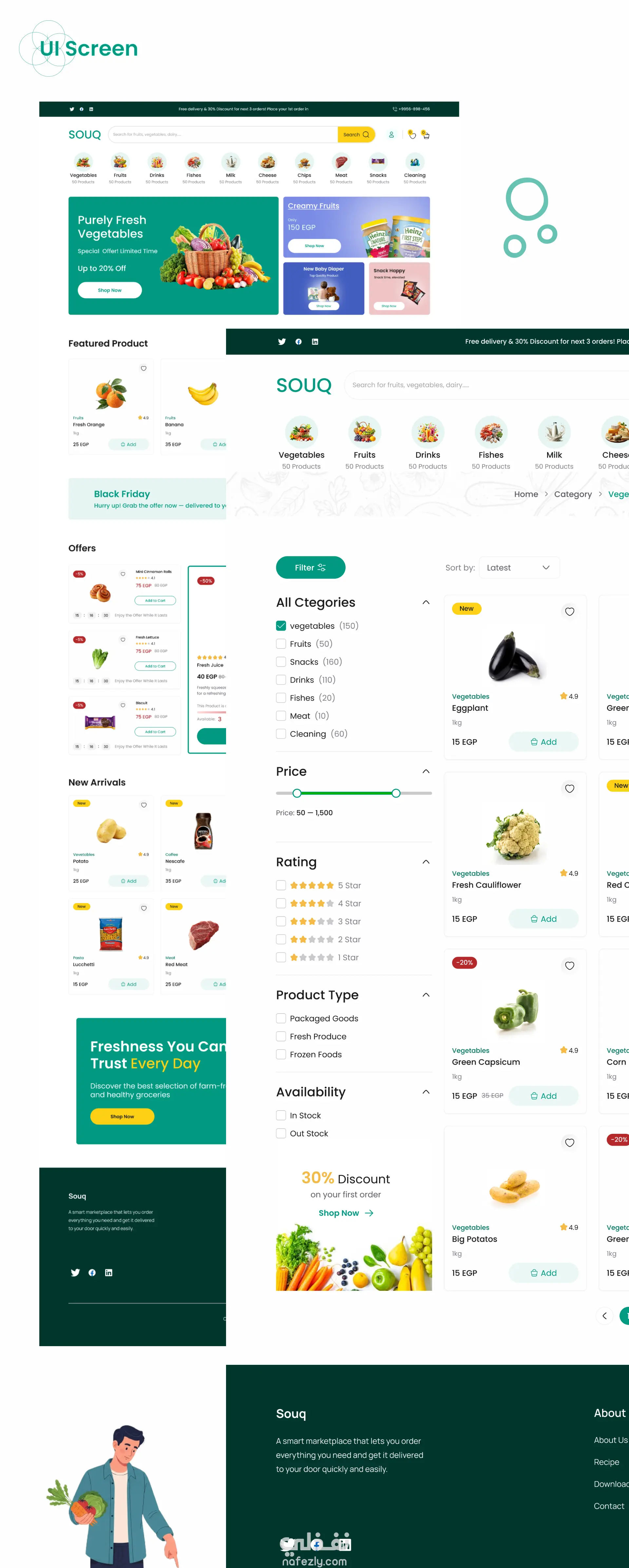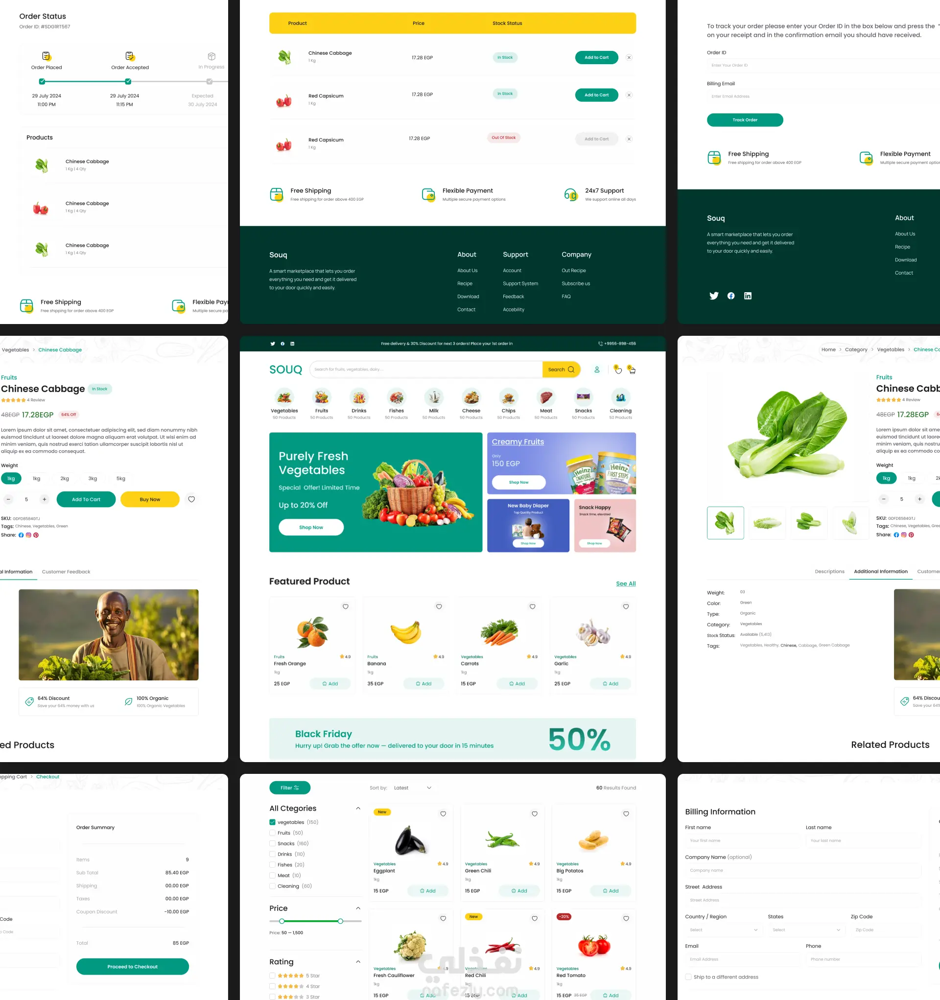 تصميم واجهة متجر إلكتروني لبيع الخضروات والفواكه يركز على سهولة التصفح وسرعة إتمام الطلب. يشمل الصفحة الرئيسية، عرض المنتجات، تفاصيل المنتج، الفلترة، السلة، وإتمام الشراء، مع نظام لتتبع الطلبات. تم الاهتمام بتجربة مستخدم سلسة وهوية بصرية مستوحاة من ألوان الطبيعة لتعكس مفهوم المنتجات الطازجة.