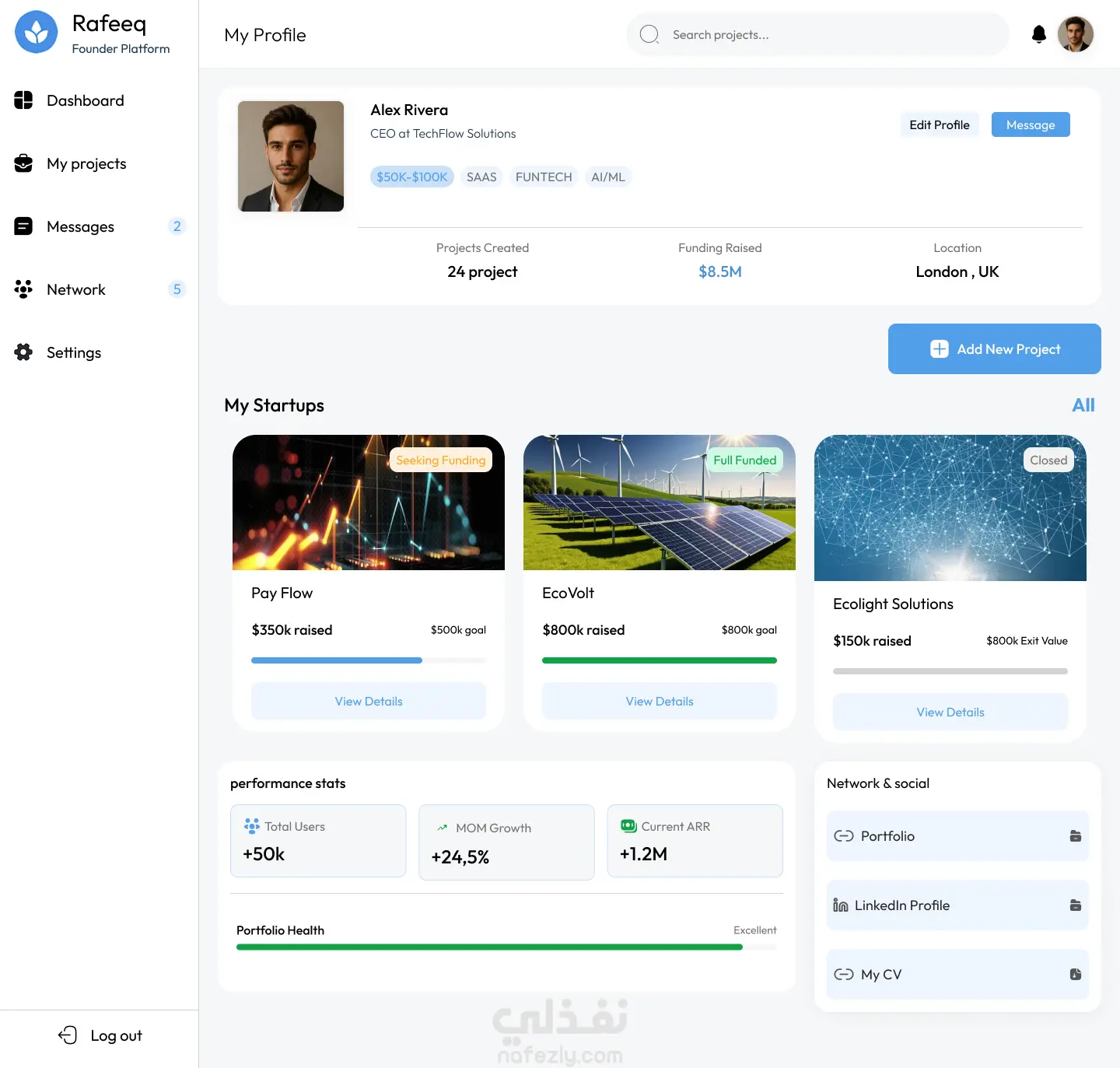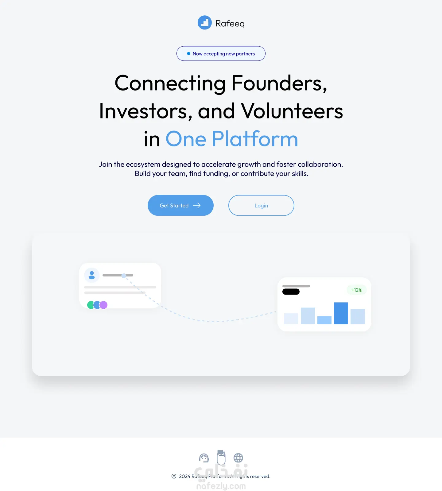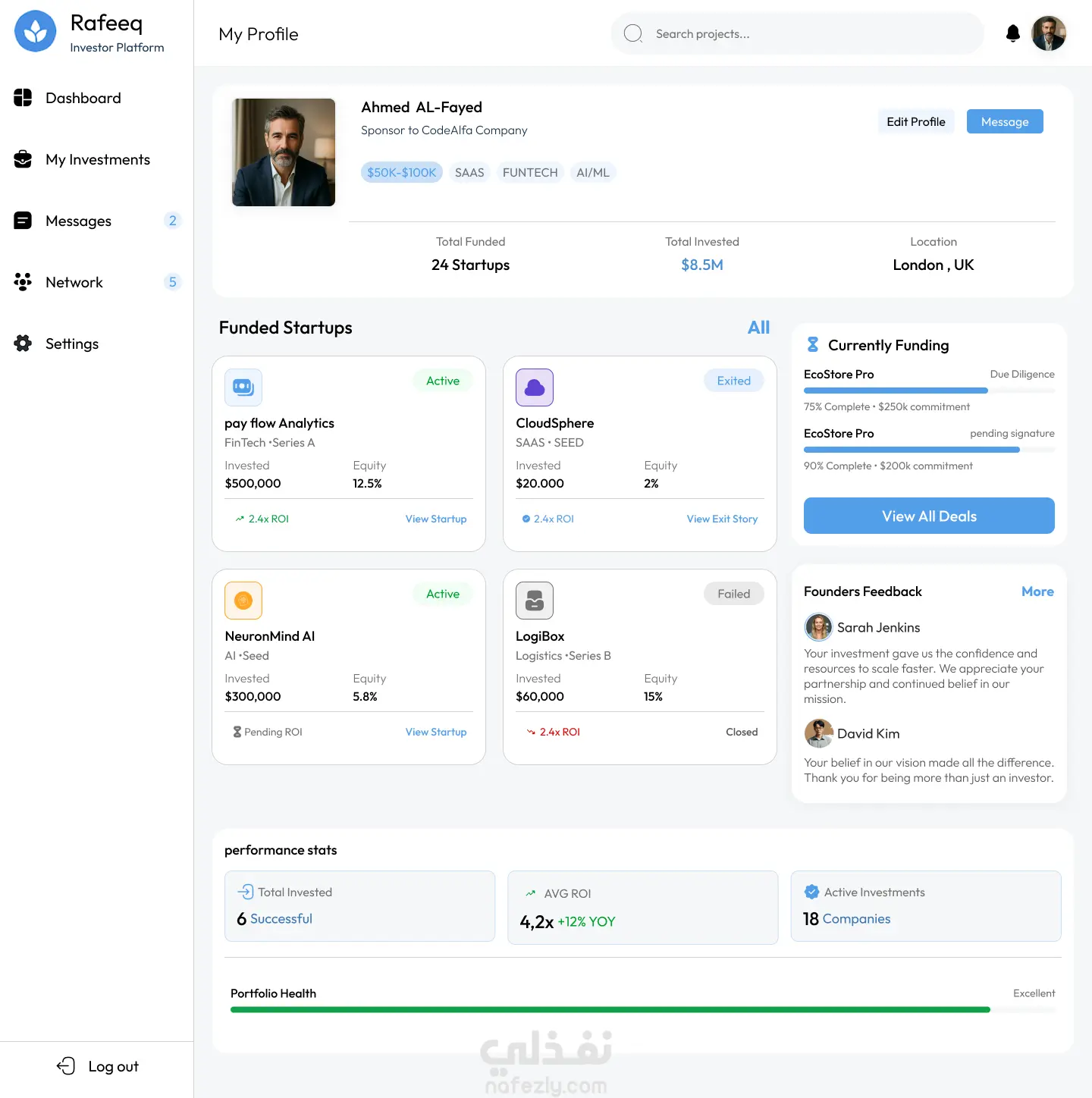 قمت بتصميم واجهة ويب متكاملة لمنصة "Rafeeq" التي تهدف إلى ربط رواد الأعمال (Founder) بالمستثمرين (Investor).