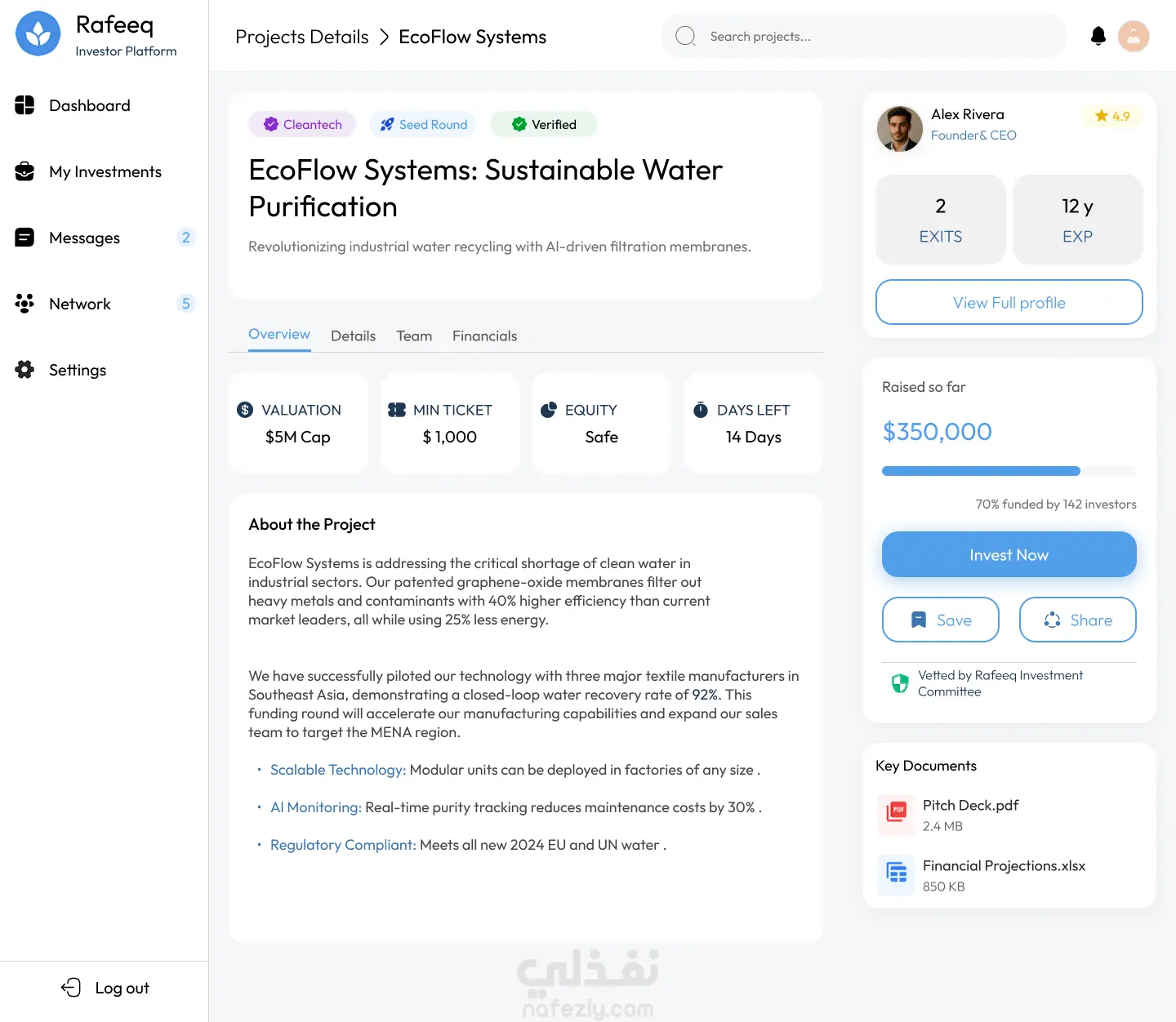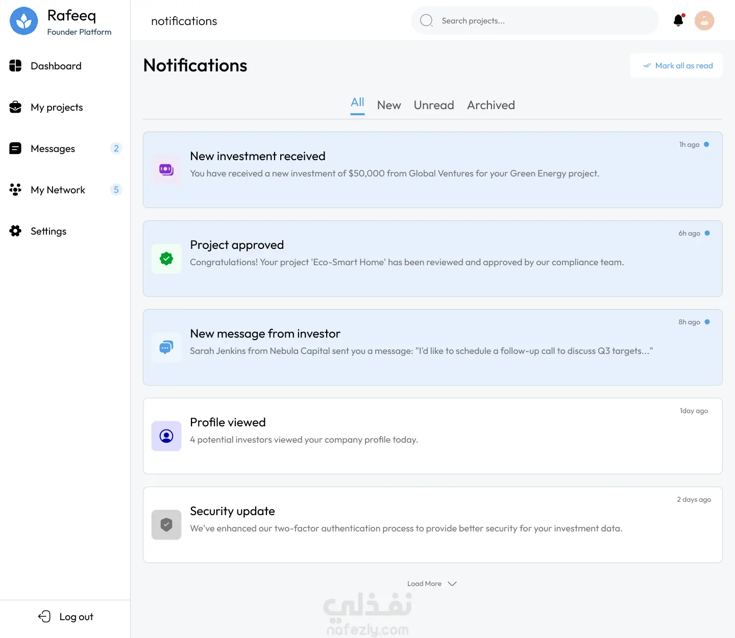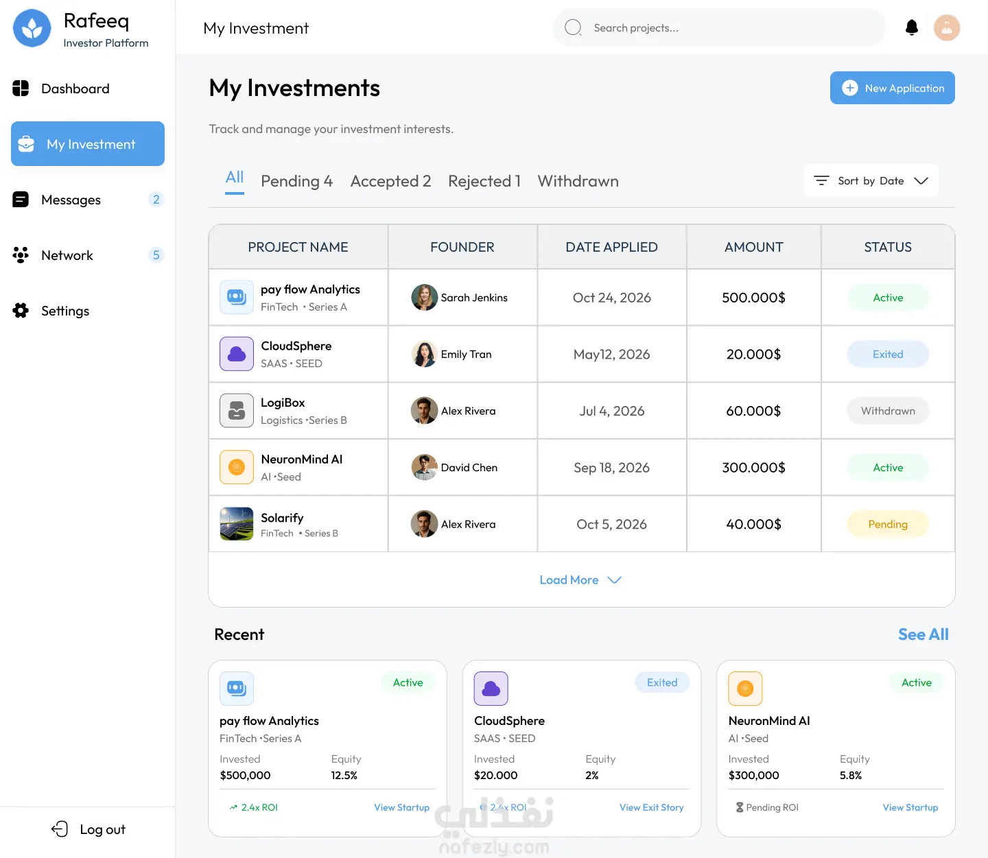 قمت بتصميم واجهة ويب متكاملة لمنصة "Rafeeq" التي تهدف إلى ربط رواد الأعمال (Founder) بالمستثمرين (Investor).