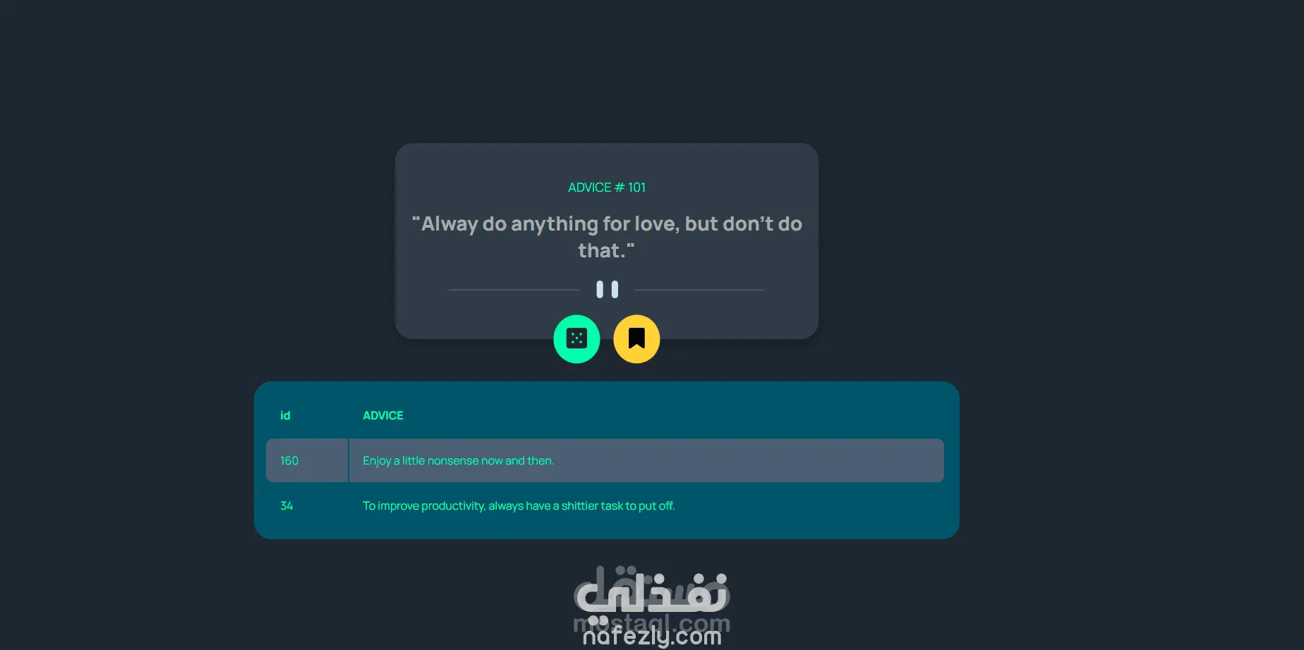 تصميم وتطوير تطبيق ويب تفاعلي لتوليد النصائح بشكل عشوائي (Advice Generator App) بواجهة عصرية وتجربة استخدام بسيطة وسلسة، يتيح للمستخدم الحصول على نصيحة جديدة بضغطة زر.