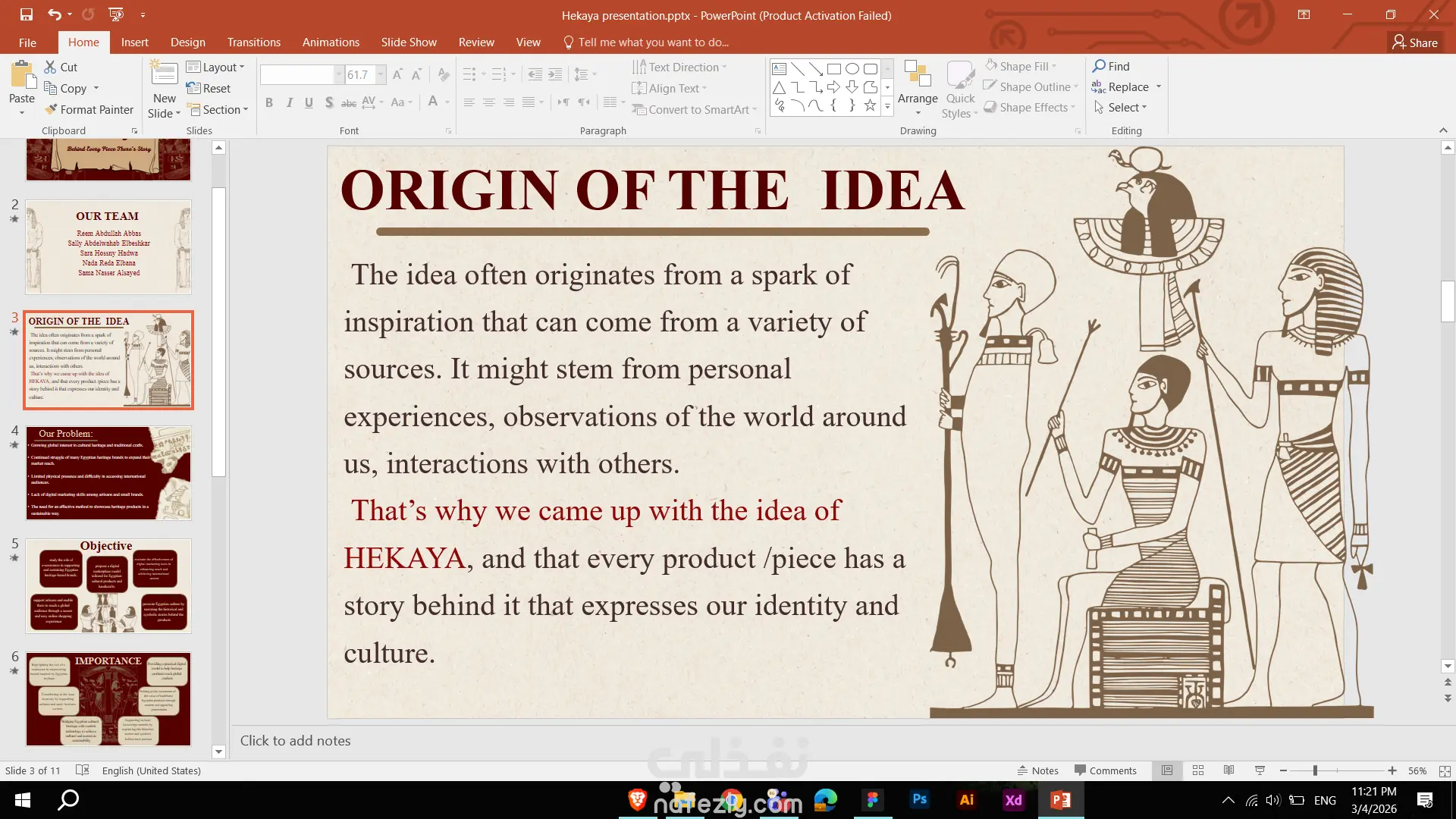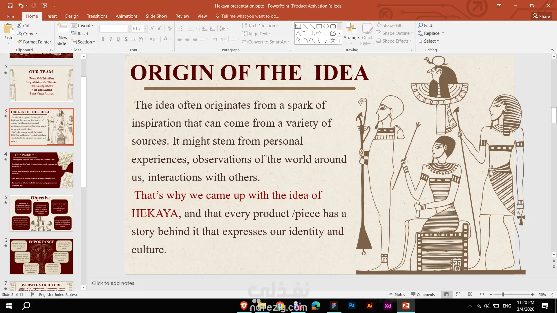 يتضمن هذا العمل تصميم عرض تقديمي احترافي لمشروع “ويب حكاية”، حيث قمت بتحليل فكرة المشروع وتنظيم المحتوى وتحويله إلى عرض بصري واضح وسلس. ركزت على بناء هيكل منطقي للشرائح يبدأ بعرض المشكلة ثم الحل وأهداف المشروع والنتائج المتوقعة، لضمان سرد متكامل ومقنع. تم تصميم الشرائح بأسلوب بصري مستوحى من الهوية المصرية مع الحفاظ على الطابع العصري، مع اختيار ألوان وخطوط متناسقة تعكس فكرة الربط بين التراث والتكنولوجيا. اهتممت بتوزيع العناصر، وضوح النصوص، واستخدام أيقونات وصور داعمة لتعزيز الفهم البصري وتقليل التكدس النصي. النتيجة عرض تقديمي منظم وجذاب يعكس مهاراتي في تحليل المشاريع، تنظيم المعلومات، والتصميم البصري الاحترافي.
