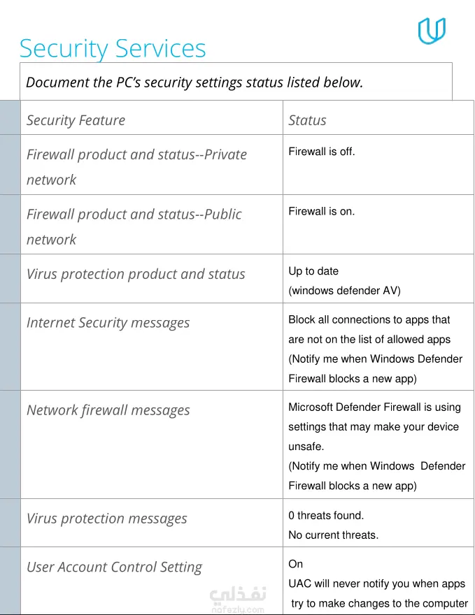 في هذا المشروع قمت بإجراء تدقيق أمني شامل لجهاز يعمل بنظام Windows 10 بهدف تحليل الإعدادات الأمنية واكتشاف نقاط الضعف المحتملة وتأمين النظام وفق أفضل الممارسات في الأمن السيبراني. شمل نطاق العمل: تنفيذ عملية جرد وتحليل مكونات النظام (Hardware / Software / User Accounts) مراجعة إعدادات الجدار الناري (Firewall) وتحليل حالة الشبكات الخاصة والعامة تقييم إعدادات Microsoft Defender Antivirus تحليل صلاحيات المستخدمين وتطبيق مبدأ Least Privilege تقييم إعدادات المصادقة والتوصية بتطبيق Multi-Factor Authentication تحديد التطبيقات غير الضرورية والمخاطر المرتبطة بها اقتراح إجراءات Hardening لتقليل سطح الهجوم تم إعداد تقرير احترافي يتضمن تحليل المخاطر والتوصيات اللازمة لتعزيز مستوى الحماية وضمان بيئة تشغيل أكثر أمانًا.