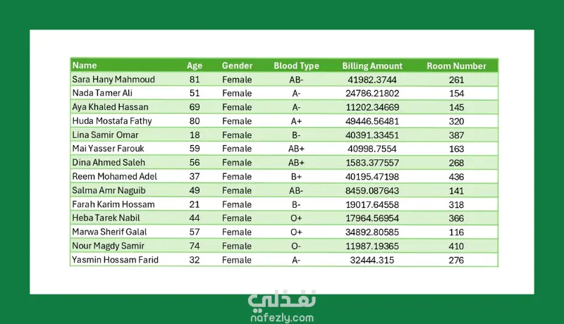 قمت بتصميم وتنظيم قاعدة بيانات طبية رقمية لعدد من المرضى. يتضمن العمل: • إدخال البيانات: تنظيم الأسماء، الأعمار، وتفاصيل الغرف بدقة. • التصنيف الطبي: فرز الحالات بناءً على فصيلة الدم والجنس. • الإدارة المالية: حساب وتنسيق مبالغ الفواتير (Billing Amount) بدقة عشرية عالية لضمان الضبط المالي. • التنسيق البصري: استخدام أدوات Excel لتصميم جدول احترافي سهل القراءة ومنظم بالألوان لتسهيل الوصول للمعلومة.