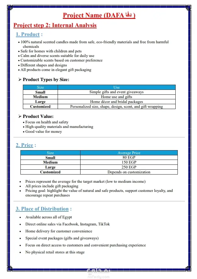 قمت بإعداد خطة تسويقية متكاملة لعلامة شموع عطرية طبيعية مصنوعة يدويًا تستهدف السوق المصري. شملت مراحل العمل: